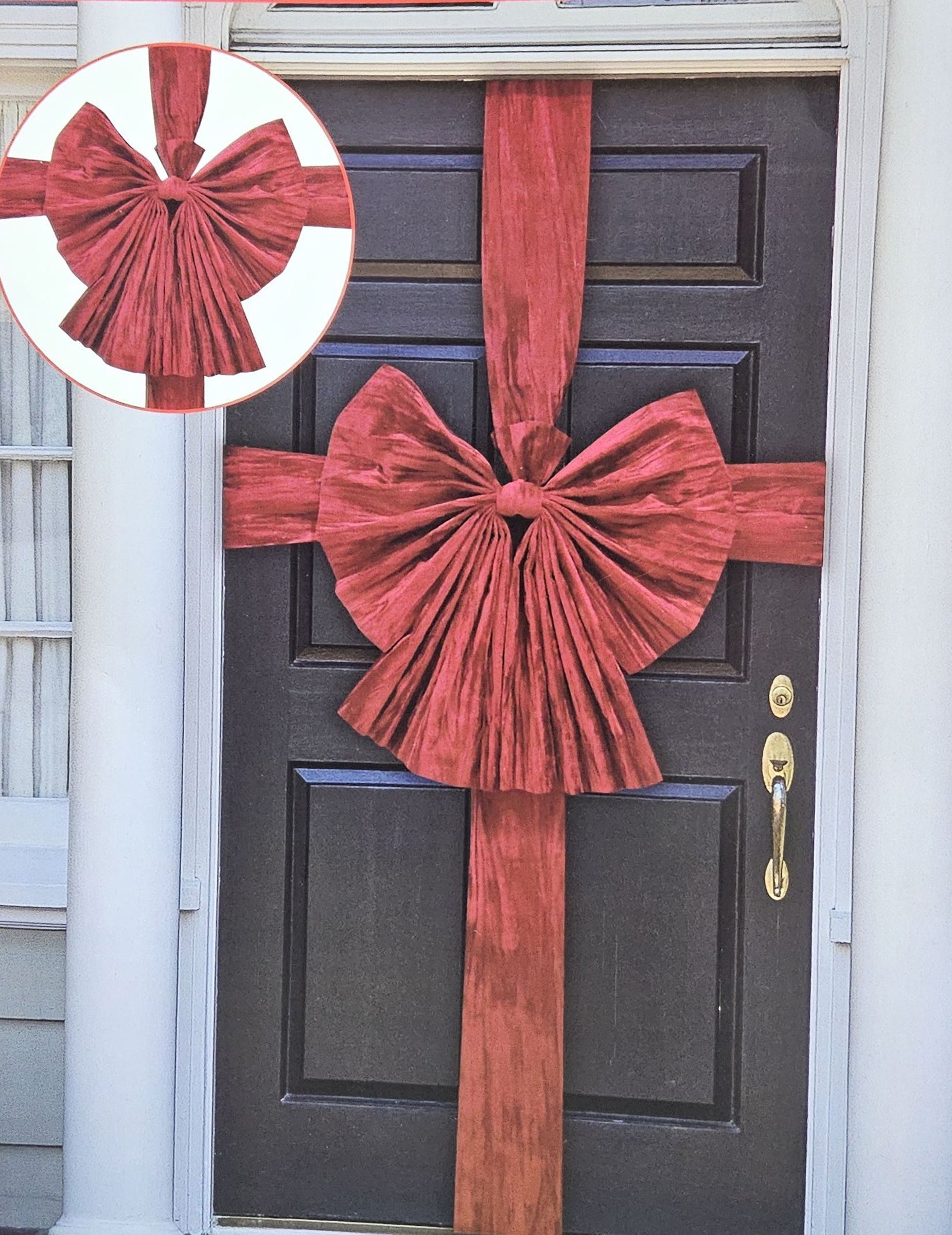 Olepšajte svoj dom s tem velikanski vozel na vratih Izdelan iz visokokakovostnega rdečega žameta. Ta dodatek je popoln za ustvarjanje toplega in elegantnega vzdušja ter postane osrednji del vaše fasade za praznike. Ko ga pritrdite na svojo vrataVaše goste pozdravlja s šarmom, hkrati pa se popolnoma ujema s temo Božič klasika.