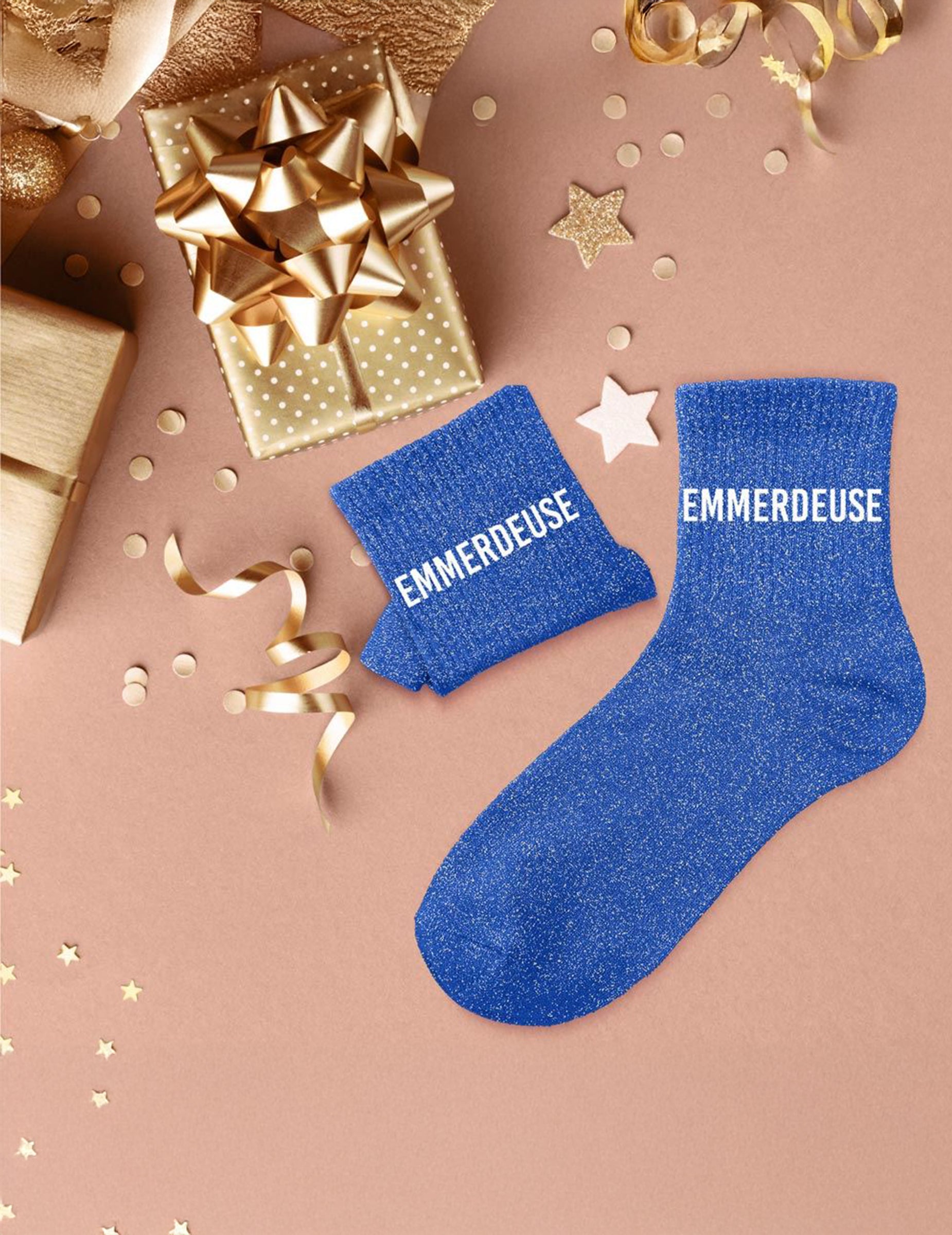 Naj vaša osebnost zasije s temi modrimi bleščečimi nogavicami za ženske, velikosti 36-42! Okrašene z besedo "EMMERDEUSE" (Prasica) z belimi črkami, združujejo drznost, humor in stil. Njihov mehak, raztegljiv material ponuja udobno nošenje, medtem ko bleščeča iskrivka doda kanček svetlobe vaši obleki. Zabaven in izviren dodatek, popoln kot darilo, polno osebnosti, ali za izražanje vašega temperamenta z briljantnostjo in humorjem.