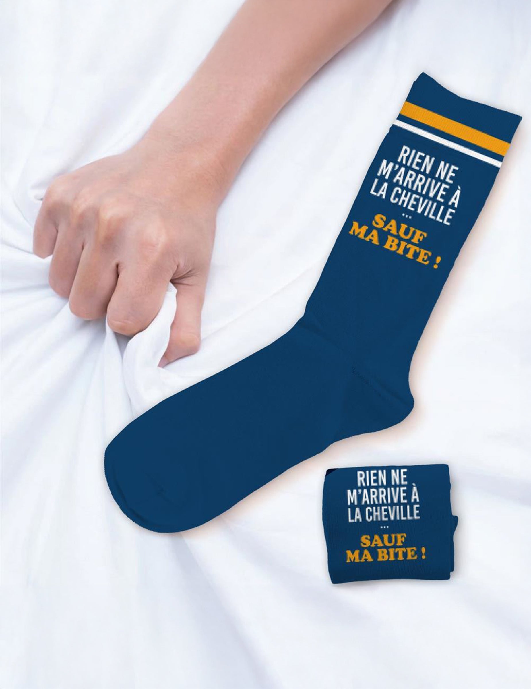 Nasmejte svoje najdražje s temi šaljivimi nogavicami v velikostih 39–45! V temno modri barvi imajo slogan »Nič mi ne more biti enako ... razen mojega penisa!«, zabaven in nenavaden dizajn, ki je kot nalašč za duhovito darilo. Njihove rumene in bele črte na vrhu dodajo športen in izviren pridih za edinstven videz. Zabaven dodatek, ki ga lahko podarite prijatelju, sodelavcu ali ljubljeni osebi za rojstni dan, zabaven dogodek ali preprosto za kanček zabave k njihovi obleki.