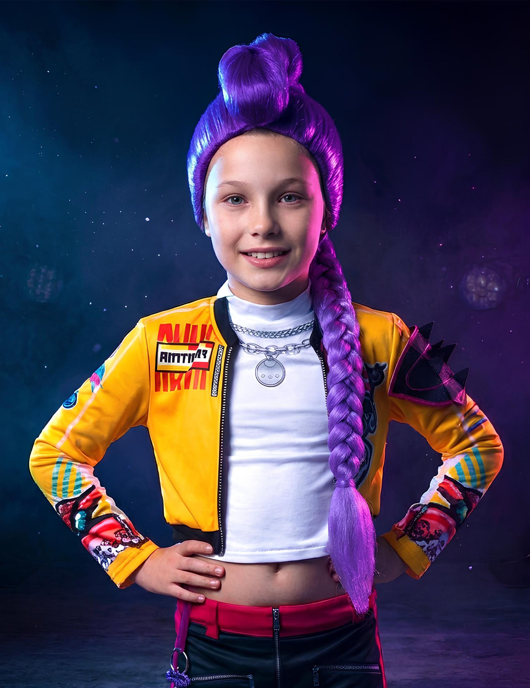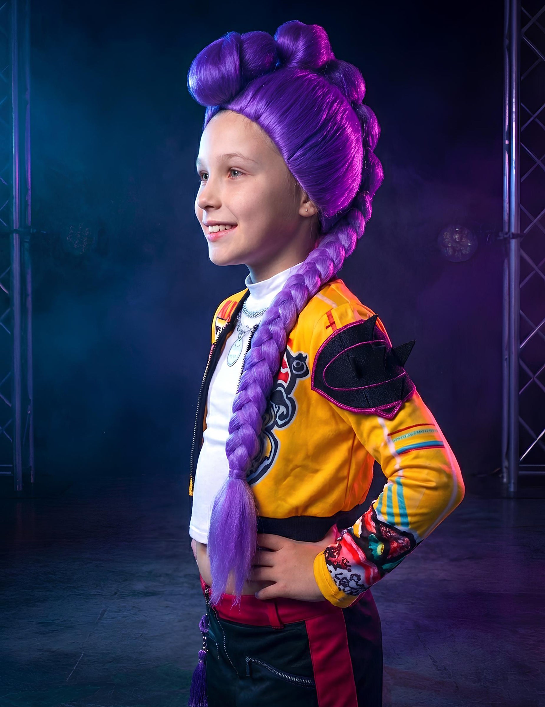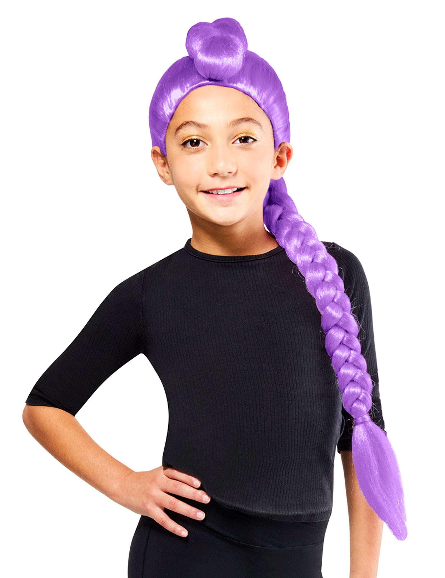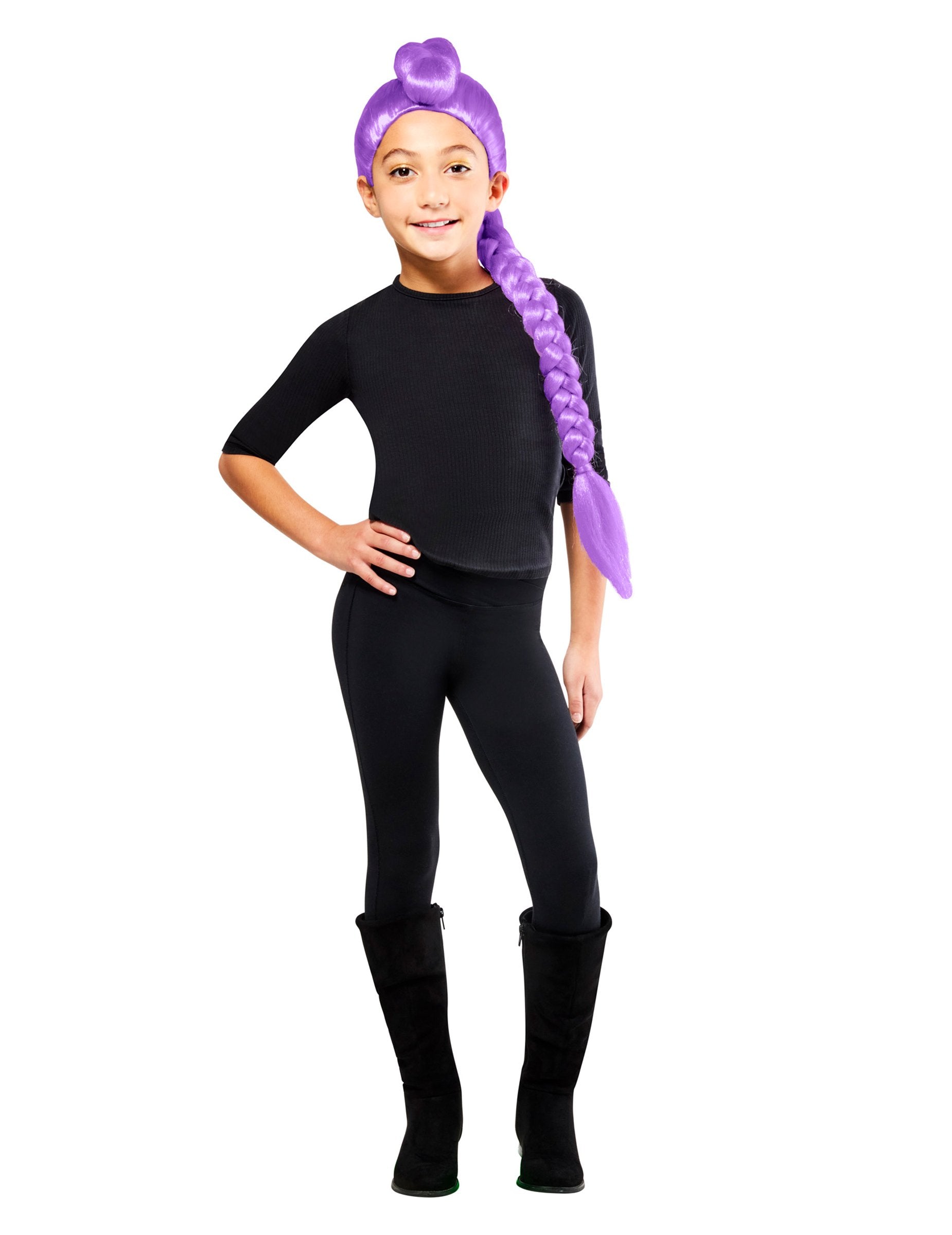 S to lasuljo Rumi Kpop Demon Hunter za dekleta se lahko vsaka otrok prelevi v pravo junakinjo uspešnega animiranega filma KPop Demon Hunters. Navdihnjena z likom Rumi, pevko in lovko na demone, ta dolga vijolična kita s figo izraža moč in slog K-pop idolov. Idealna je za pust, nastop ali zabavo v kostumih, saj bo z njo zasijala vsaka mlada oboževalka, pripravljena vstopiti v čarobni in glasbeni svet filma!