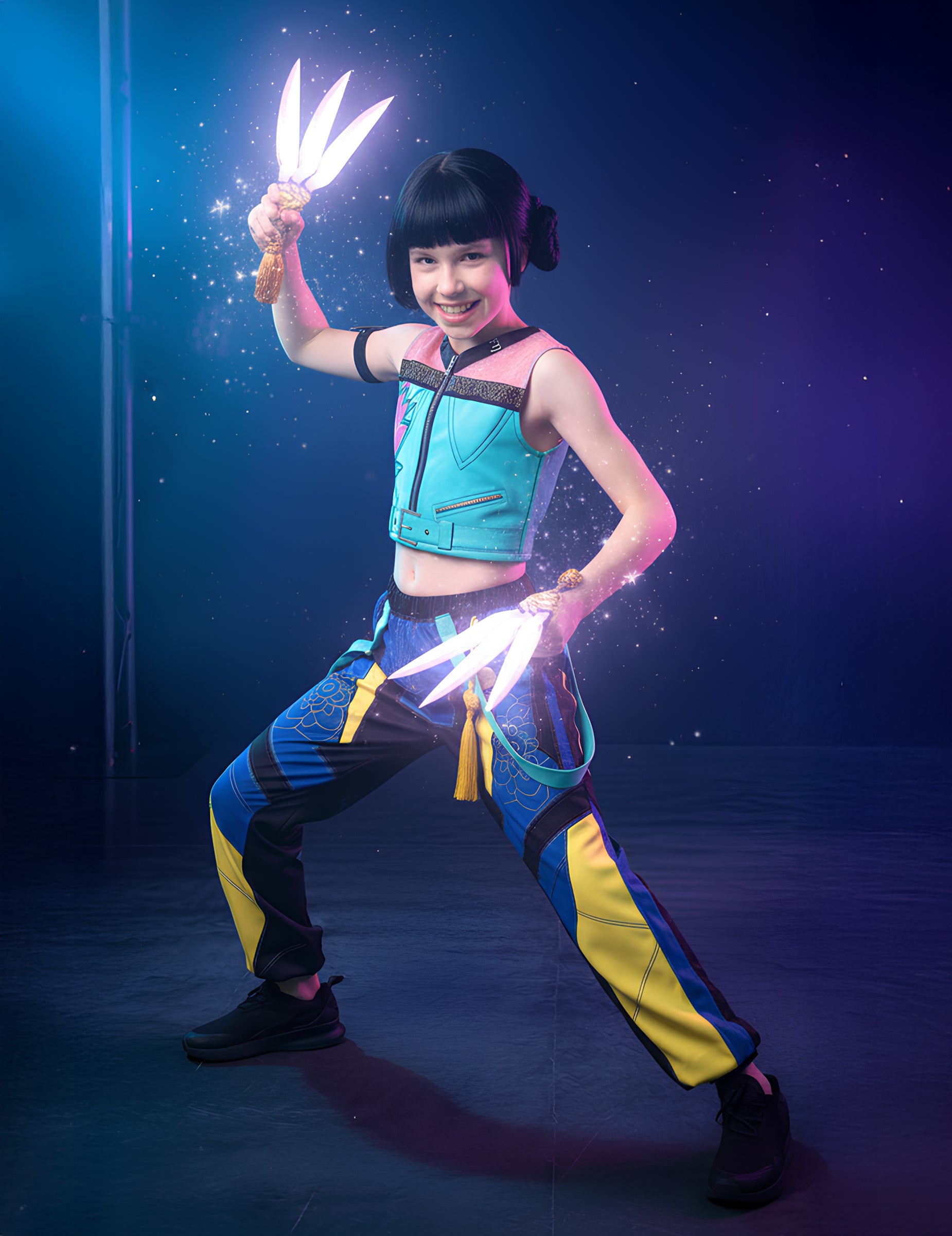 Kostum Zoey Kpop Demon Hunter™ za dekleta je sestavljen iz kratkega turkiznega topa z grafičnimi motivi in širokimi večbarvnimi hlačami, ki spominjajo na streetwear oprave junakinje.