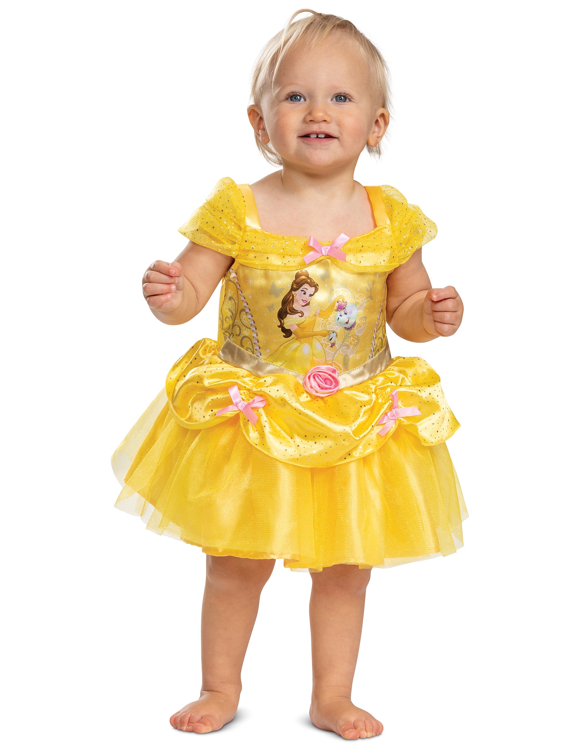 Ce déguisement Belle La Belle et la Bête pour fille, sous licence officielle Disney, plonge votre bébé dans l’univers féérique du Carnaval. La robe, d’un jaune lumineux, rappelle la tenue emblématique de Belle lors de son célèbre bal. Le haut satiné est décoré de petits nœuds roses et d’une image de Belle accompagnée de ses amis, tandis que le jupon en tulle apporte du volume. Sa fermeture à scratch dans le dos permet un enfilage simple et rapide, idéal pour les tout-petits. Une tenue resplendissante pour transformer votre enfant en véritable princesse Disney le temps d’une fête costumée ou du Carnaval.