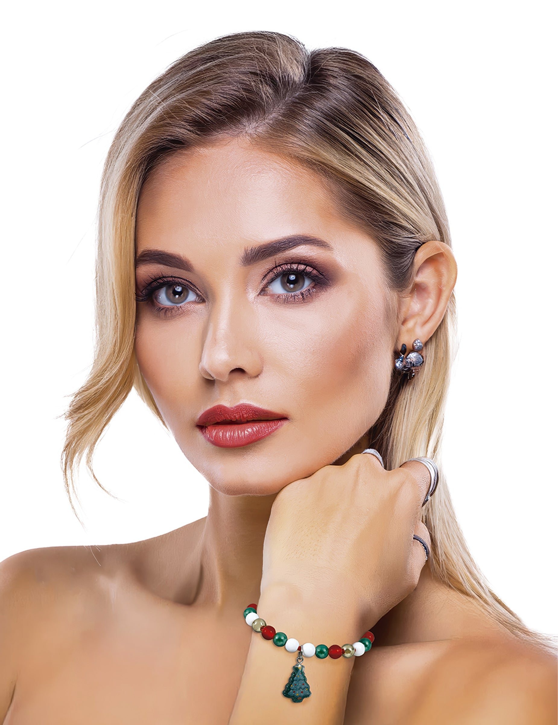 Ta zapestnica v obliki božične jelke je popoln dodatek za dopolnitev vaše praznične obleke. Izdelana je iz rdečih, zelenih, belih in zlatih perlic ter ima majhen okrašen obesek v obliki jelke za vesel in barvit pridih. Pritrjena je na nastavljivo rdečo vrvico in se enostavno prilega vsem velikostim zapestja. Popolna je za dodajanje svetlega in zabavnega pridiha vašim božičnim praznovanjem, bodisi doma, v pisarni ali med praznično večerjo.