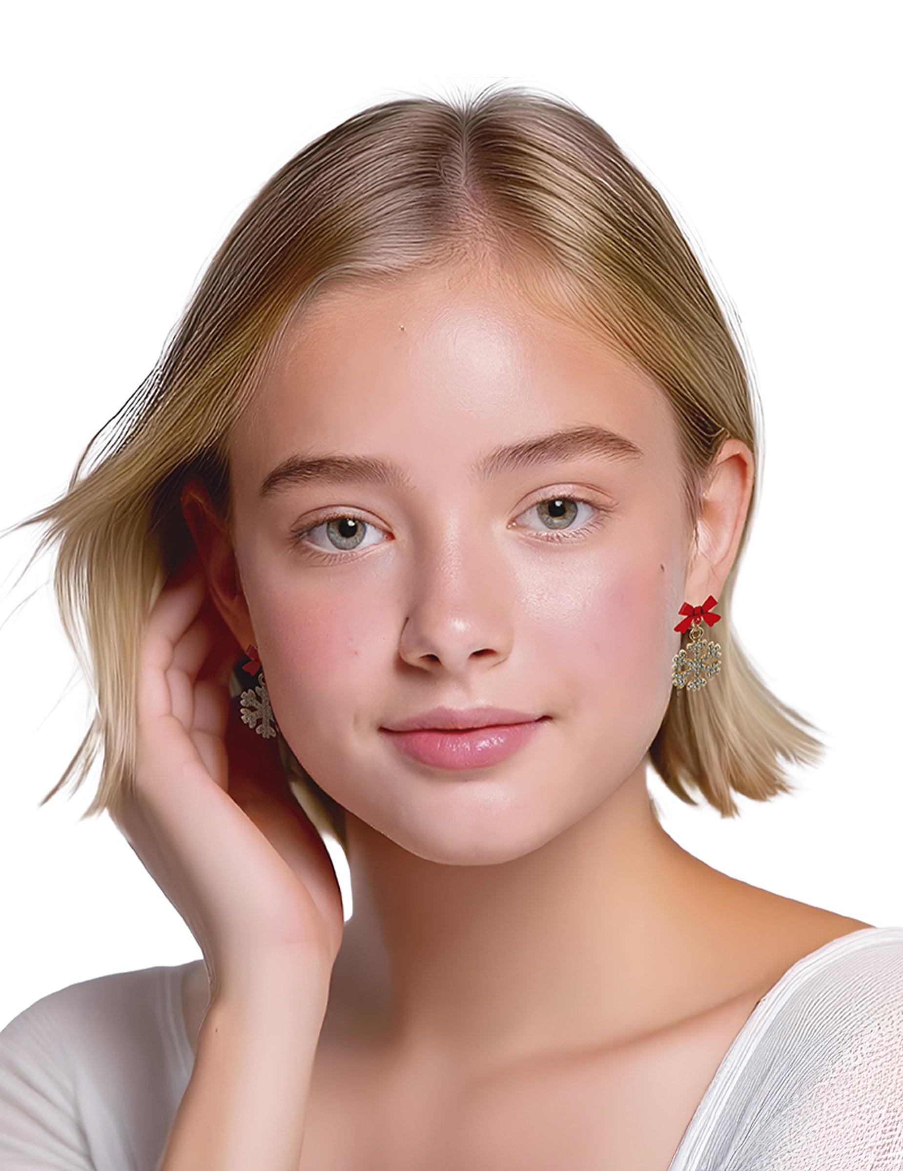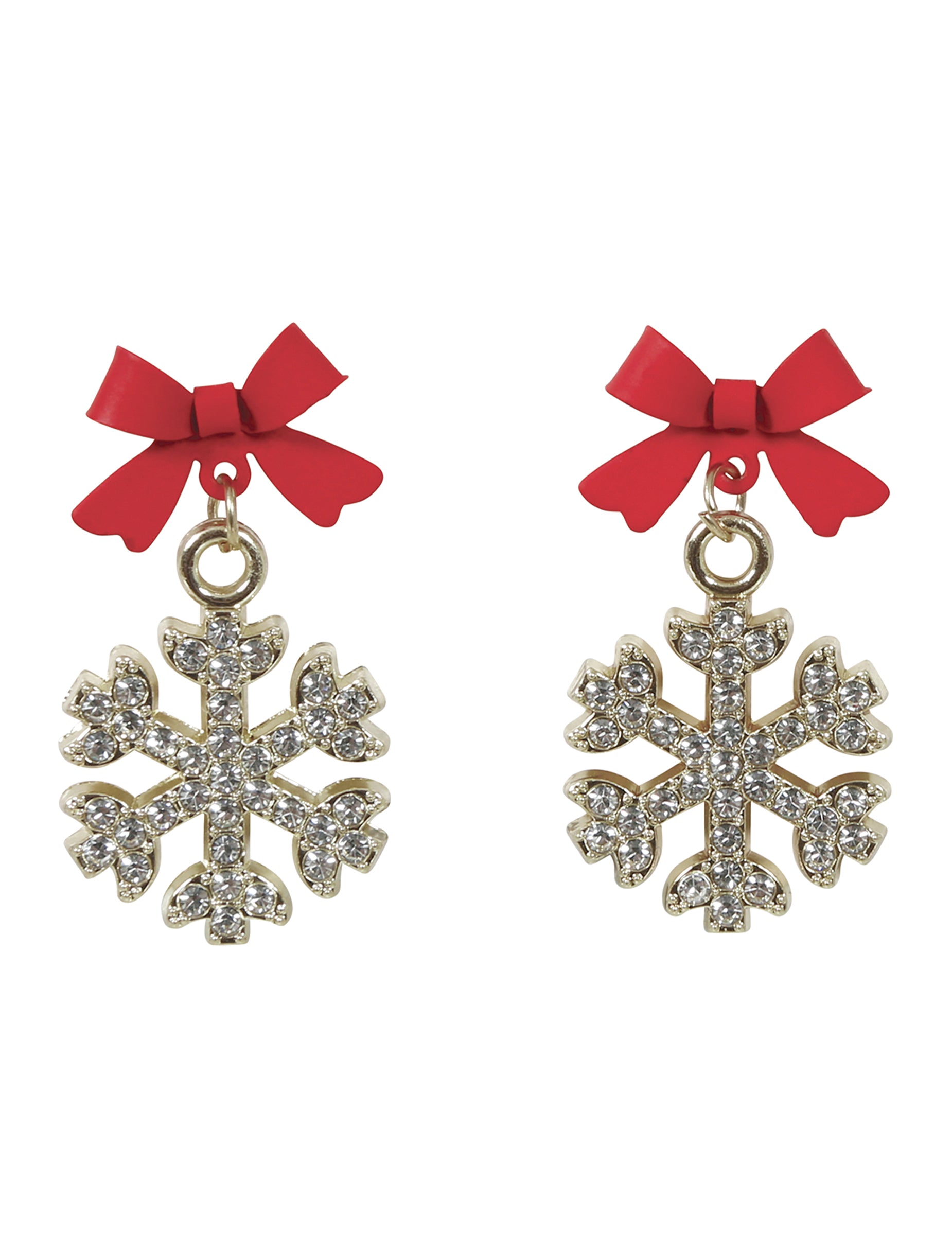 Ti bleščeči kovinski uhani v obliki snežinke dodajo eleganten in bleščeč pridih vašim prazničnim oblačilom. Vsaka zlata snežinka je okrašena z rdečo pentljo, ki vzbuja božično čarobnost in nežno osvetljuje vaš obraz. Lahki in udobni, jih lahko enostavno nosite čez dan ali za praznični večer. Popoln kos nakita, ki bo vaš božični slog dopolnil s prefinjenostjo in izvirnostjo.