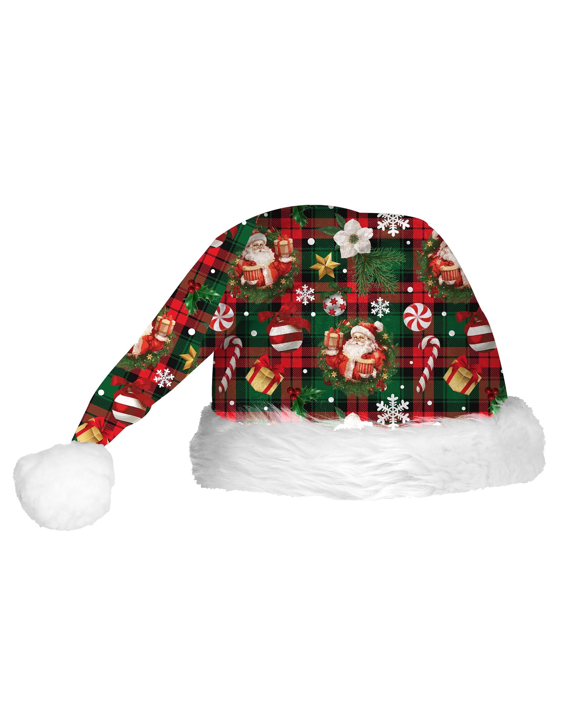To božična kapa z vzorcem tartana Ta kolekcija za odrasle z eleganco obuja duh praznikov. Na zeleno-rdečem karo ozadju se prepletajo lepi motivi Božička, daril, snežink in sladkornih palčk, kar ustvarja klasičen in vesel videz.