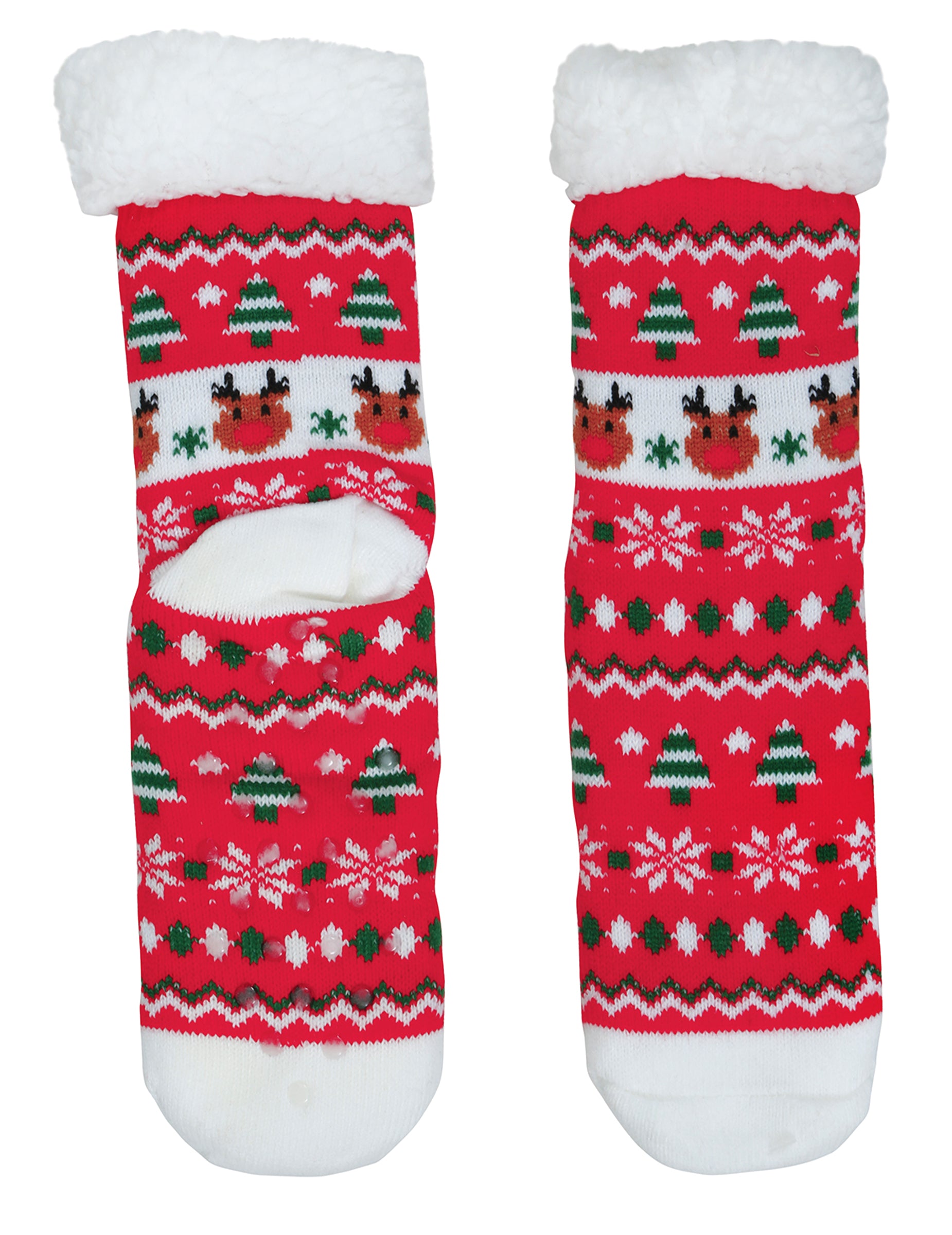 Te rdeče božične termo nogavice za odrasle z motivom severnih jelenov združujejo toplino in praznično veselje. Okrašene z motivi severnih jelenov, jelk in snežink, predstavljajo ikonične barve sezone za vesel videz. Njihova mehka notranjost in bela obroba iz umetnega krzna ponujata neustavljivo udobje, idealno za sproščanje ob ognju med prazniki.