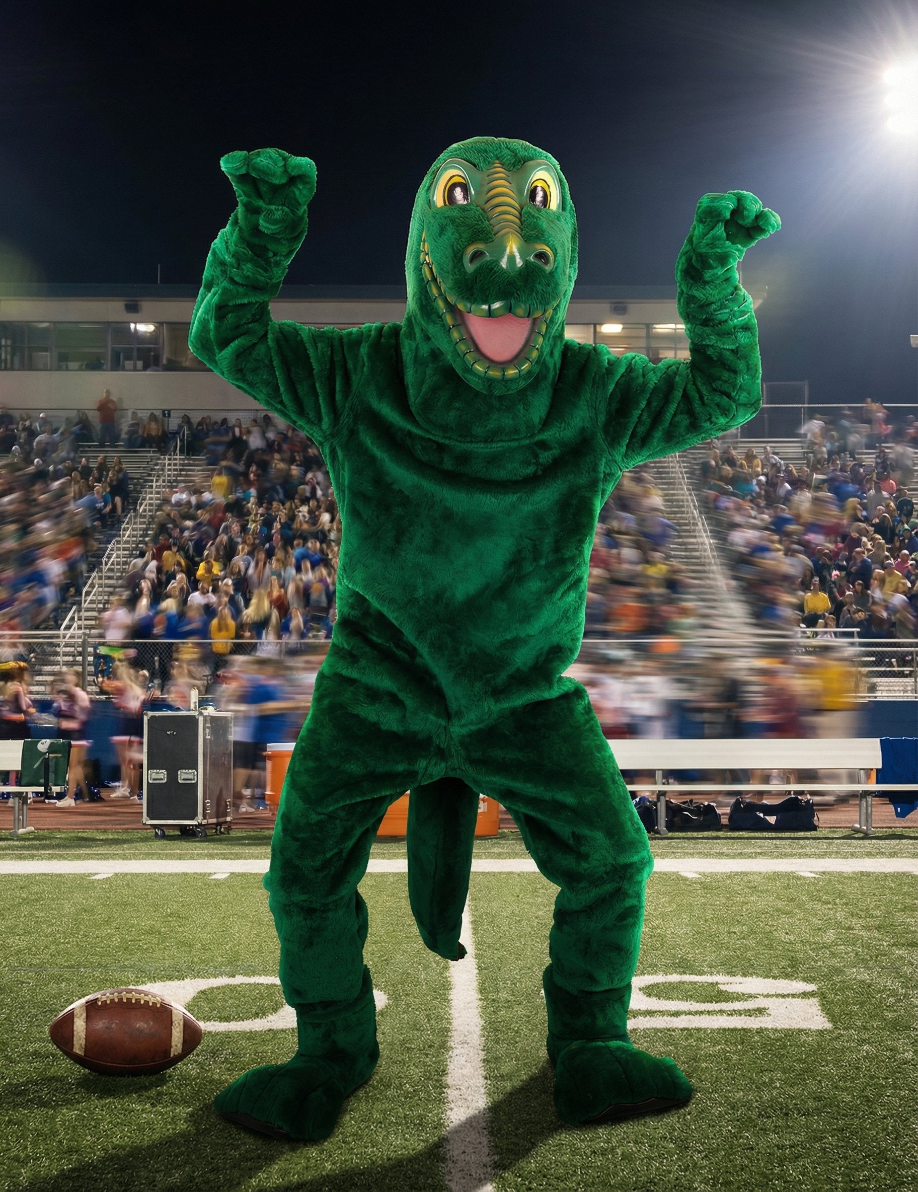 Ta maskotski kostum dinozavra za odrasle vključuje mehak kombinezon in veliko, nasmejano masko, ki vas v trenutku spremeni v zabavnega dinozavra. Zelen kombinezon pokriva telo za brezhiben videz, na hrbtu pa je za dodaten učinek pritrjen rep. Maska prikazuje veliko dinozavrovo glavo z izraznimi očmi in širokimi usti. Roke in noge so integrirane, da ohranjajo enotno silhueto od glave do pet. Popoln maskotski kostum, ki bo poživil karneval, rojstnodnevno zabavo ali kateri koli drug praznični dogodek.