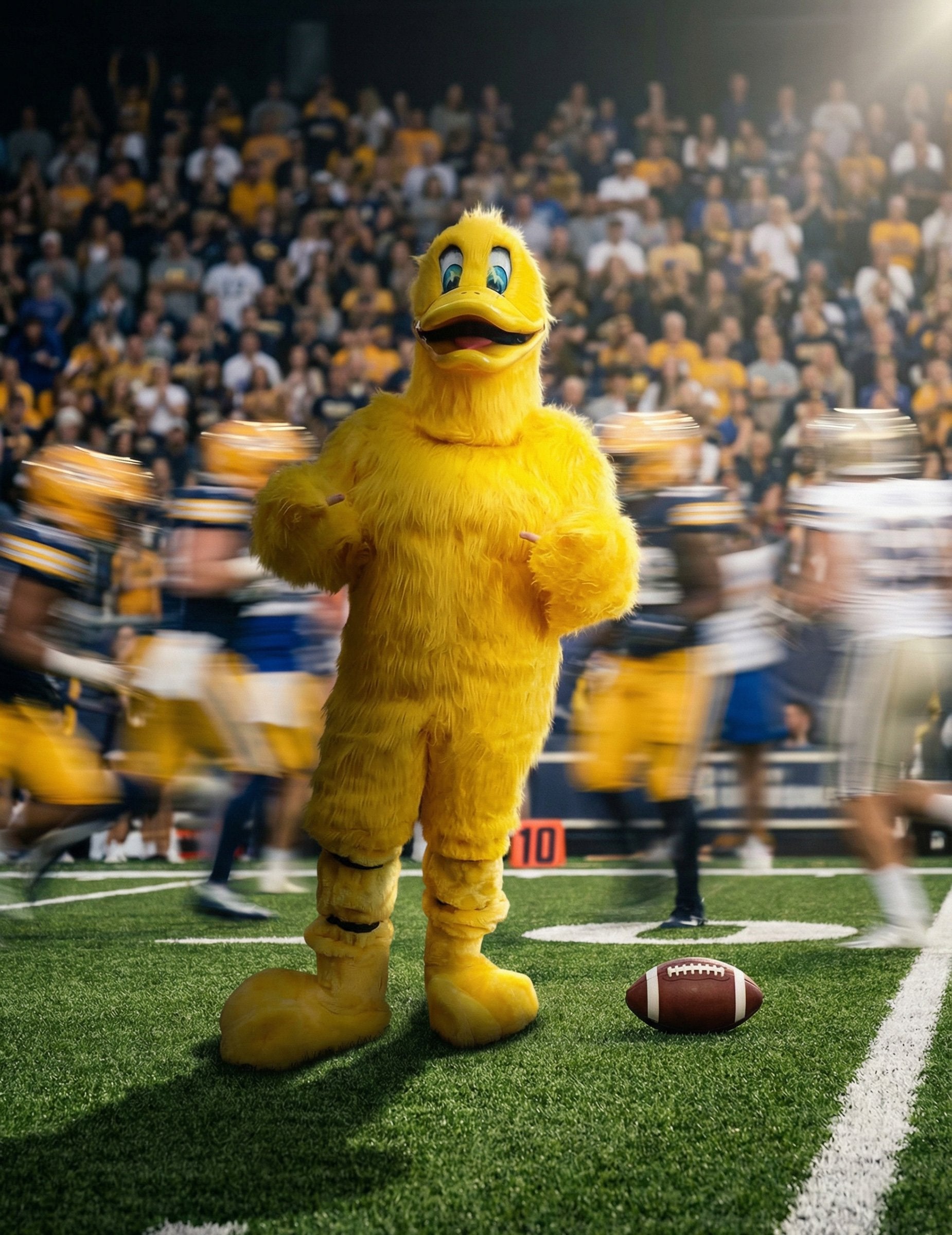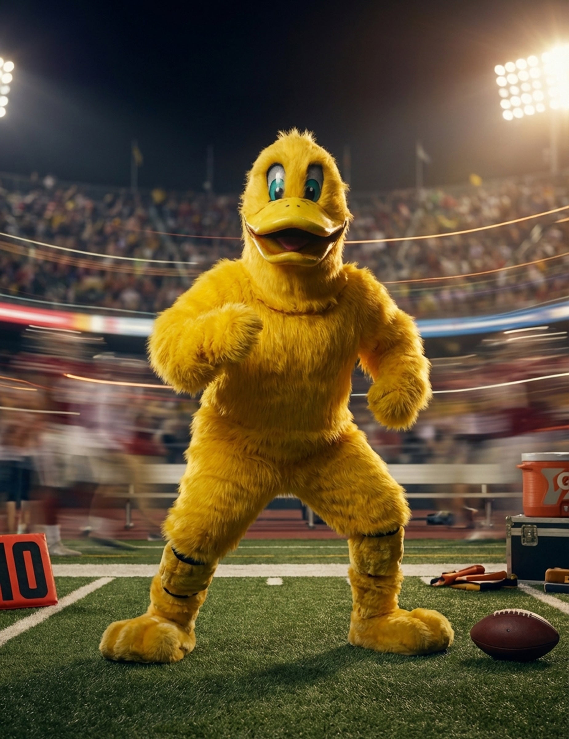 Ta vrhunski kostum maskote rumene race za odrasle je zasnovan tako, da ponuja urejen in prijeten videz za karneval ali rojstnodnevno zabavo. Vključuje kombinezon, par rokavic, masko in prevleke za čevlje, kar vam omogoča, da ustvarite celoten lik od konic kril do stopal. Kombinezon, v celoti prekrit z gostim rumenim umetnim krznom, ima mehak, enoten videz, ki takoj pritegne pogled. Njegov ohlapen kroj omogoča svobodo gibanja, ne glede na to, ali želite hoditi, pozdravljati ali voditi skupino. Rokavice so istega odtenka rumene za popolno kontinuiteto na rokah. Maska je osrednji del kostuma: njena okrogla oblika, širok kljun in velike, pisane oči ji dajejo živahen in prijazen izraz. Podrobnosti obraza ustvarjajo močno in lahko prepoznavno prisotnost, idealno za privabljanje tako otrok kot odraslih. Za popoln videz se prevleke za čevlje ovijejo okoli stopal, da ohranijo silhueto race vse do tal. Ta vrhunski kostum prinaša vesel videz in vam omogoča, da ustvarite toplo vzdušje skozi celotno zabavo, pa naj gre za dobrodošlico, zabavo ali fotografiranje z gosti.