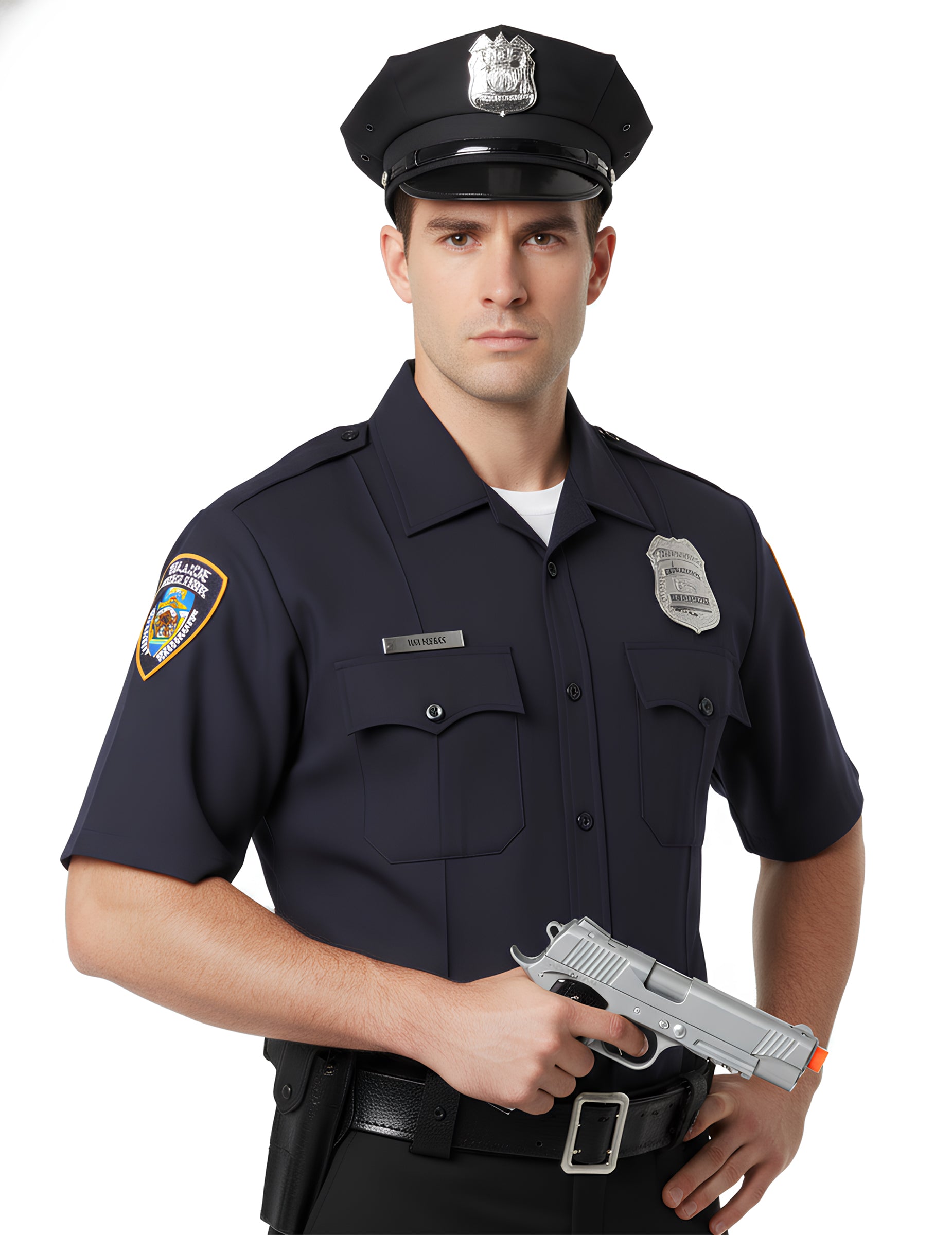 Ta 18-palčna kovinska policijska pištola cm Ta preprost dodatek je kot nalašč za policijsko obleko. Njegova ravna oblika spominja na sodobno orožje, s temnim ročajem in barvno konico, ki jasno kaže, da gre za igračo. Zaradi kompaktne velikosti ga je enostavno držati, kar vam omogoča, da se prevzamete kot zaščitnik ali policist. Idealen dodatek za karneval, kostumsko zabavo ali kostum policista.