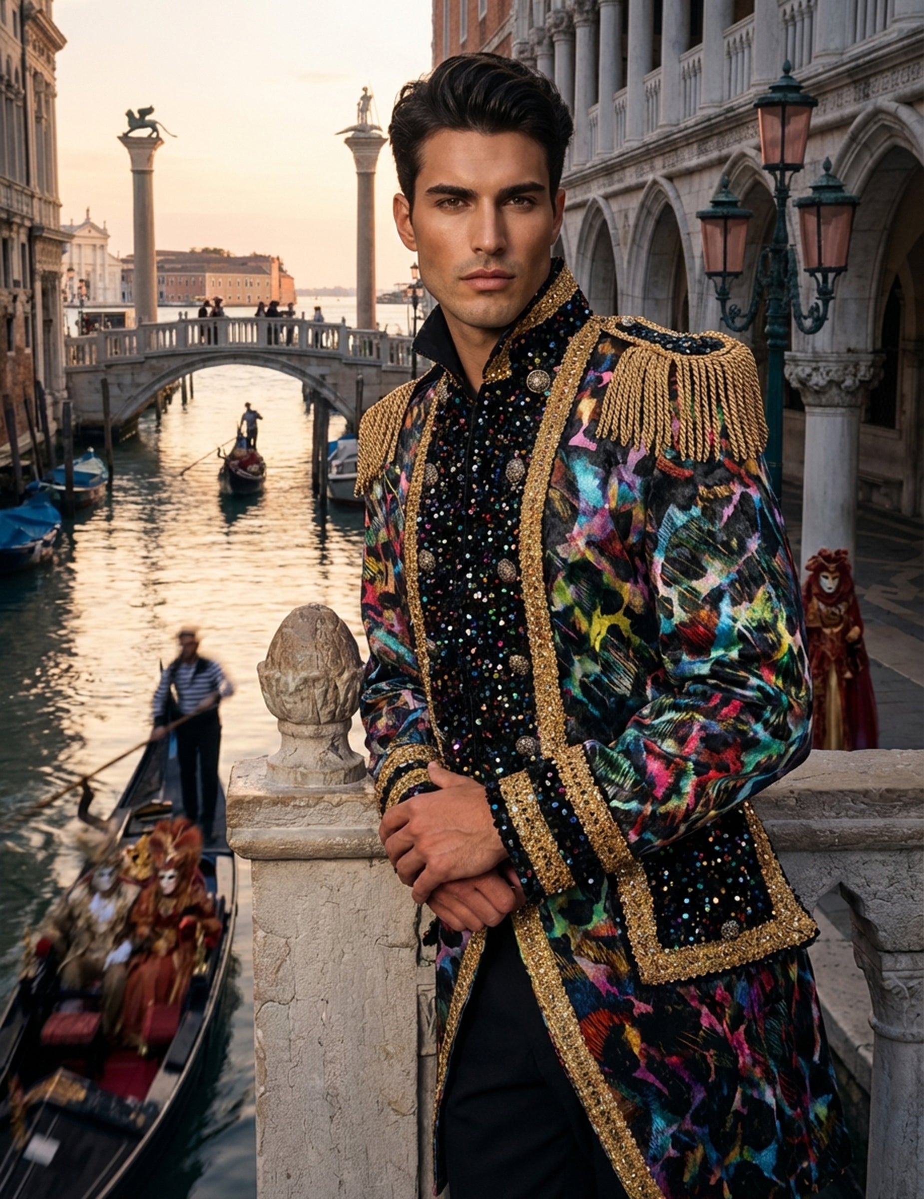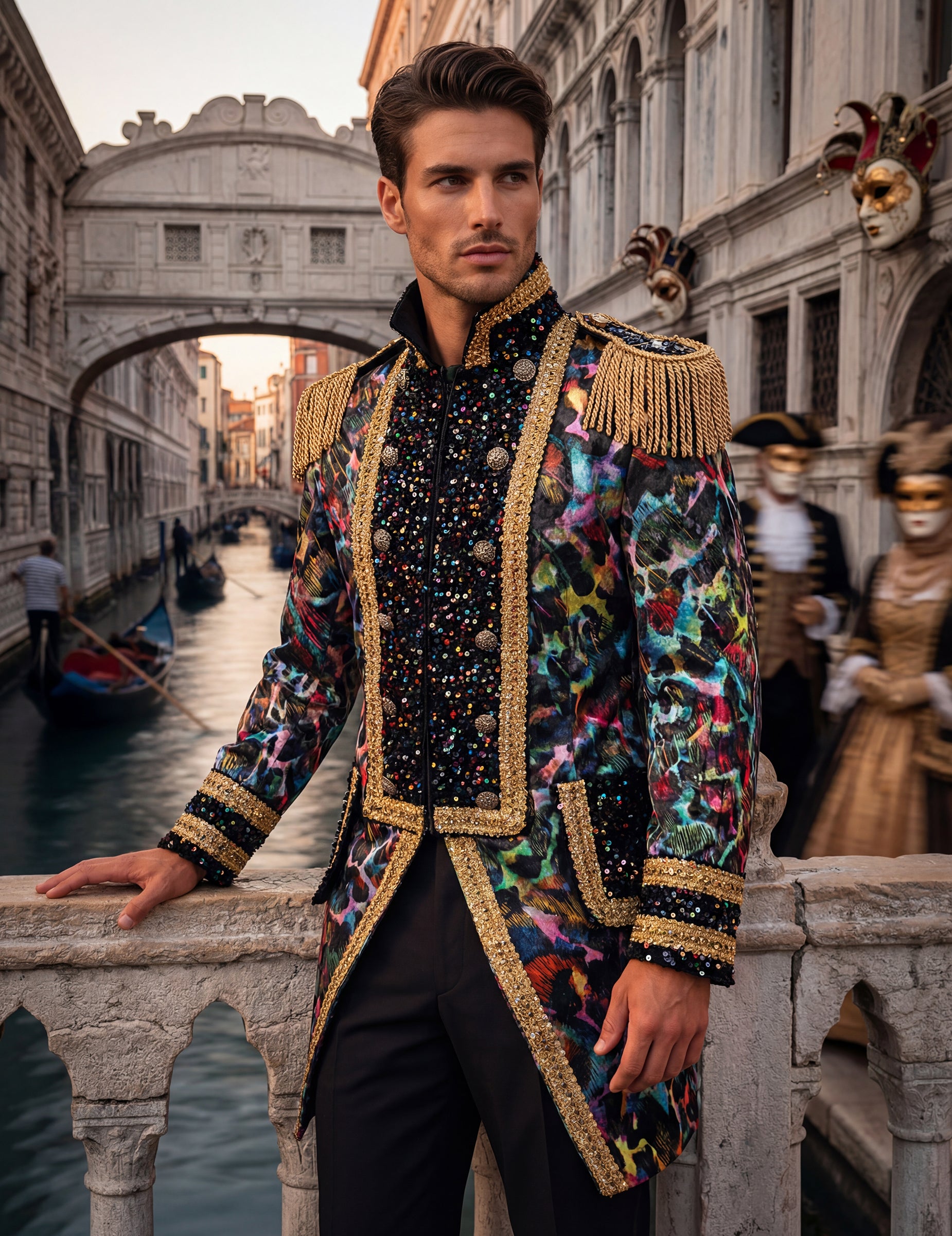 Ta vrhunska moška karnevalska jakna v živahnih neonskih barvah izstopa s svojimi intenzivnimi odtenki in zlatimi obrobami, kar poudarja njen praznični videz. Resaste epolete definirajo silhueto, bleščeče črte in večbarvni vzorci pa dodajo kanček energije. Celoten učinek poudarja gibanje in ustvarja presenetljivo prisotnost, idealno za dopolnitev drzne obleke. Popolna je za karneval ali kostumsko zabavo in brez težav dopolnjuje videz, ki želi izstopati s stilom.