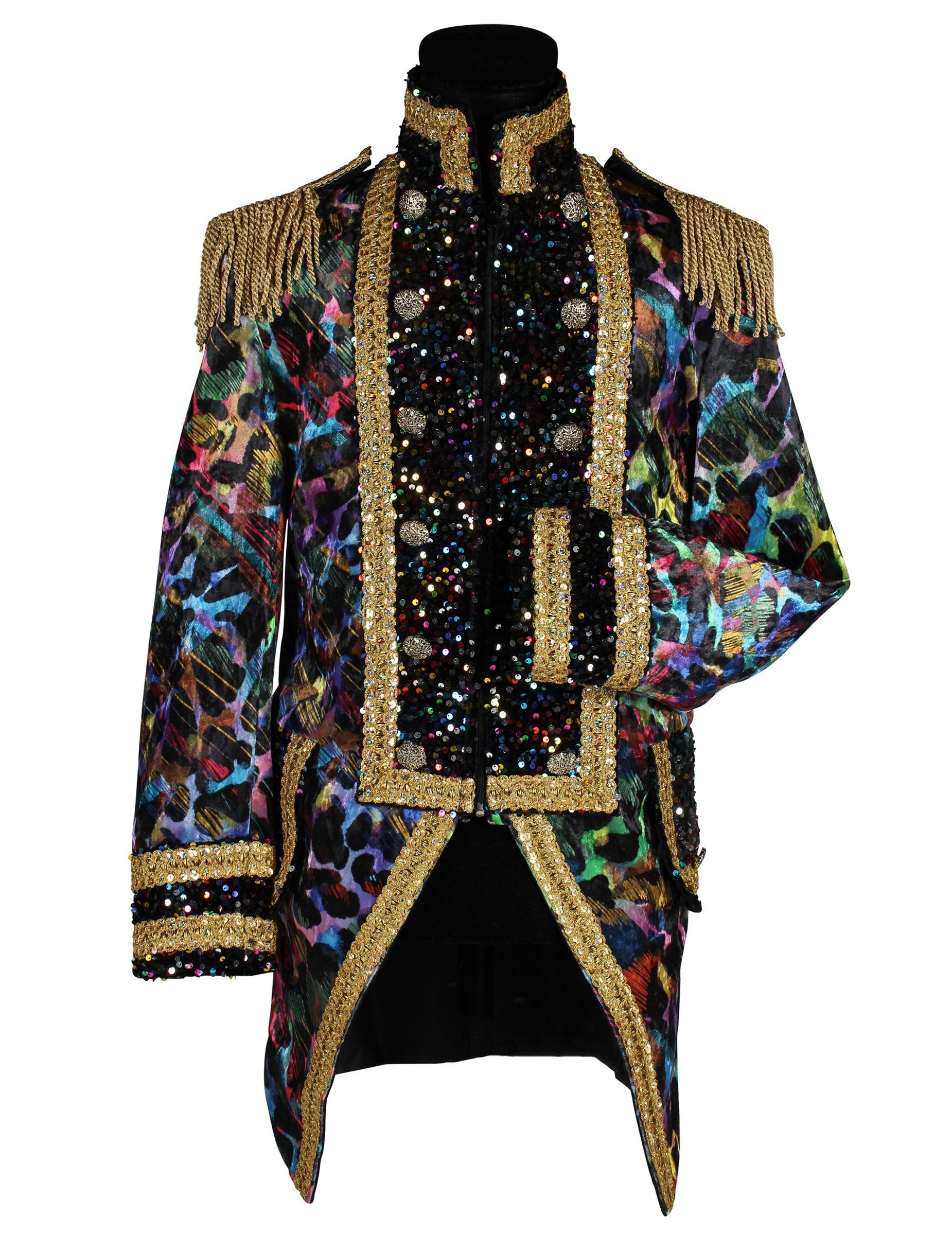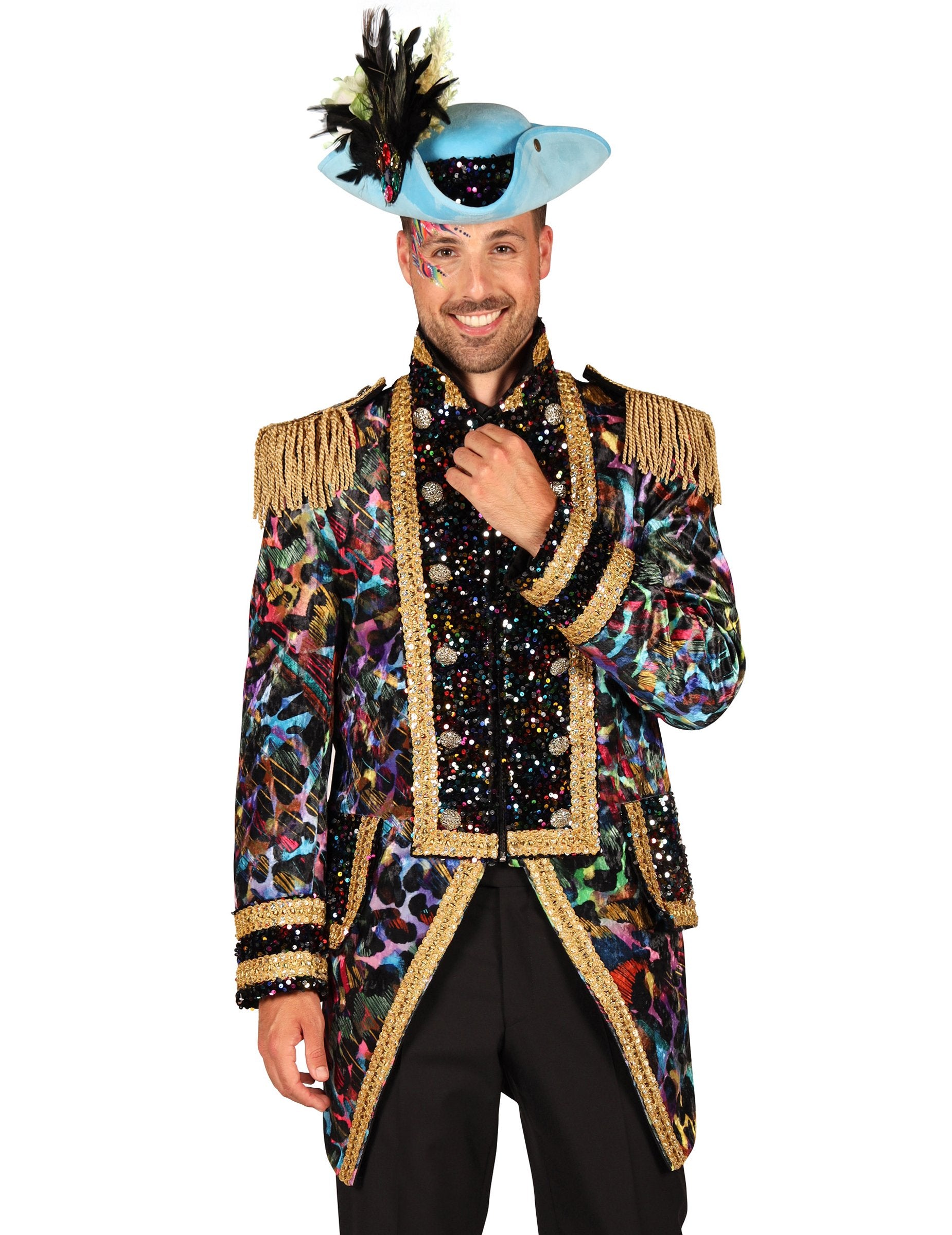 Ta moška karnevalska jakna visoke kakovosti v fluorescentnih barvah izstopa z intenzivnimi odtenki in zlatimi zaključki, ki poudarijo njen praznični videz. Ojačane ramenske blazinice s cofki oblikujejo silhueto, medtem ko bleščeči trakovi in večbarvni vzorci dodajo močno energijo. Celoten videz poudari gibanje in ustvari izrazito prisotnost, idealno za dopolnitev izrazitega kostuma.