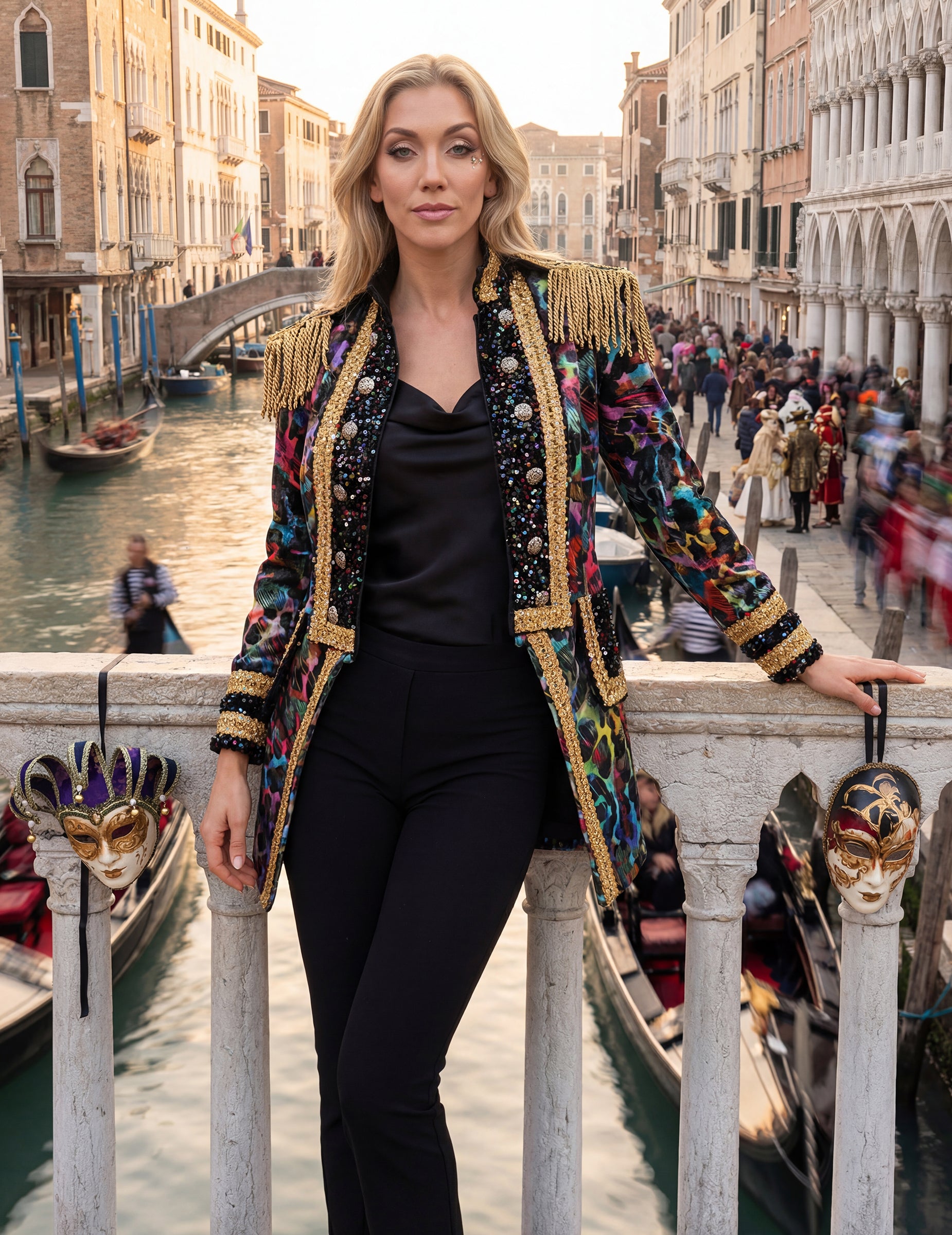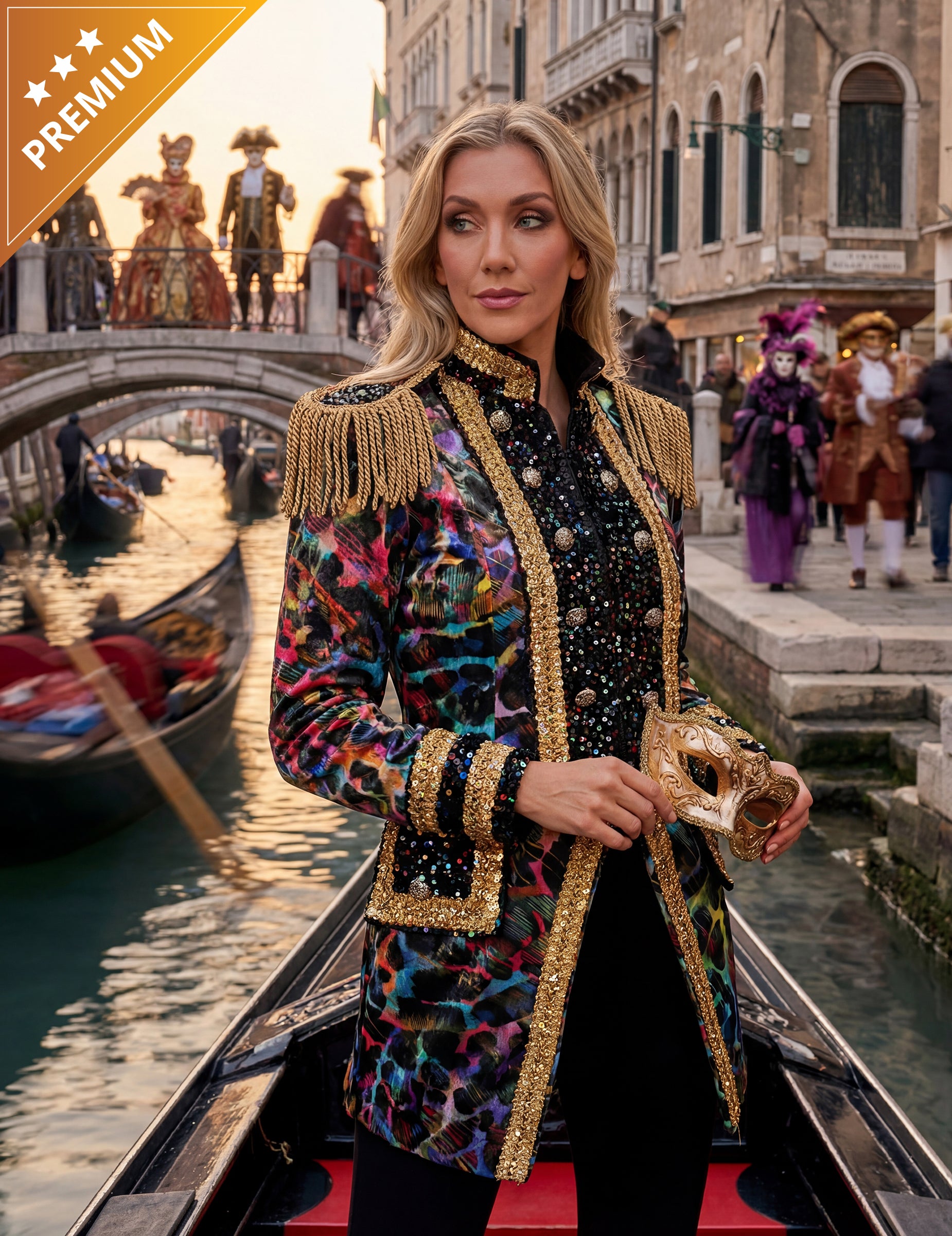 Ta vrhunska ženska karnevalska jakna v živahnih neonskih barvah izstopa s svojimi bleščečimi odtenki in zlatimi okraski, ki laskajo celotni silhueti. Resaste epolete poudarjajo zgornji del oblačila, medtem ko bleščeče črte in pisani vzorci povečujejo njegov praznični videz. Rezultat je energičen in izrazen slog, ki je kot nalašč za poživitev zabavne obleke. Idealna je za karneval ali kostumsko zabavo in zlahka dopolnjuje videz, namenjen pritegovanju pozornosti.