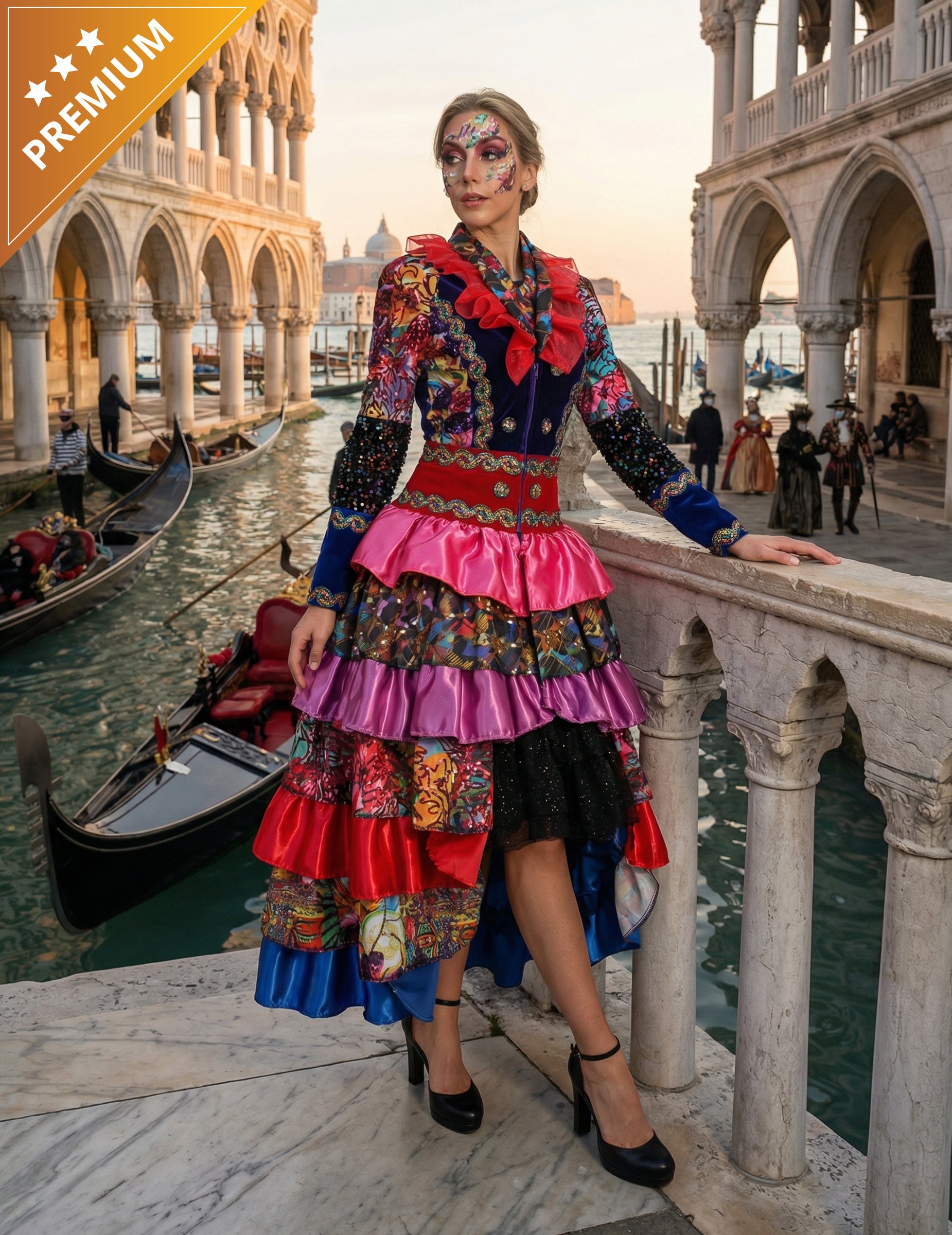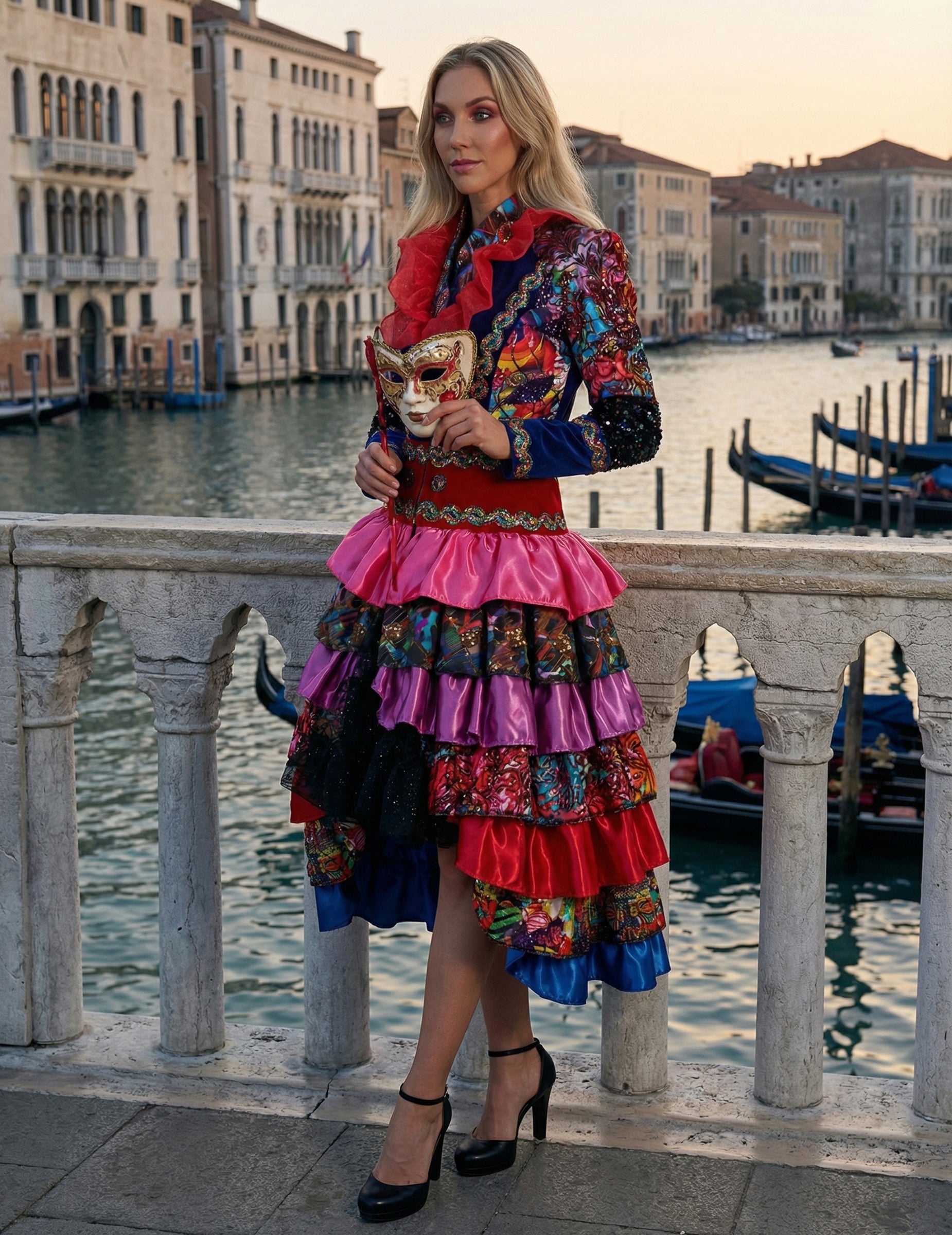 Ta vrhunska, večbarvna ženska karnevalska jakna v slogu Fiesta Carnavale izstopa s svojimi živahnimi odtenki in privlačnimi prazničnimi vzorci. Okrašeni rokavi, definiran ovratnik in kontrastni robovi ustvarjajo dinamičen videz, večbarvni detajli pa dodajo vesel in značajski pridih. Dizajn laska postavi in daje močan vtis, zato je kot nalašč za zabavo. Idealna je za karneval ali kostumske zabave in odlično dopolnjuje videz, ki želi narediti drzen vtis.