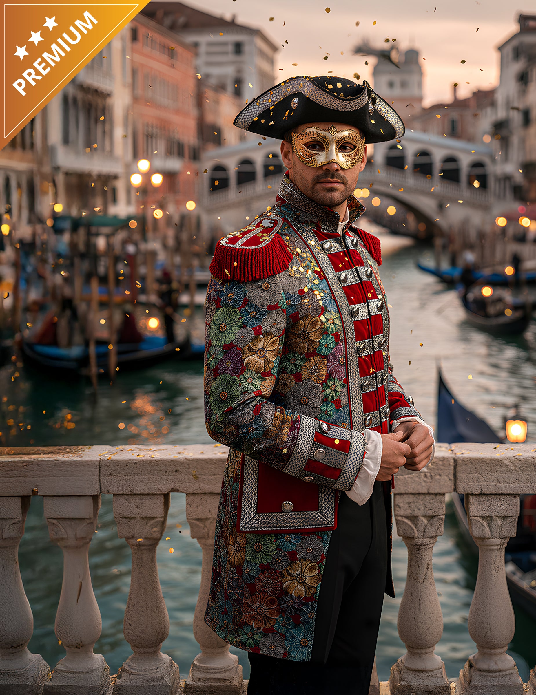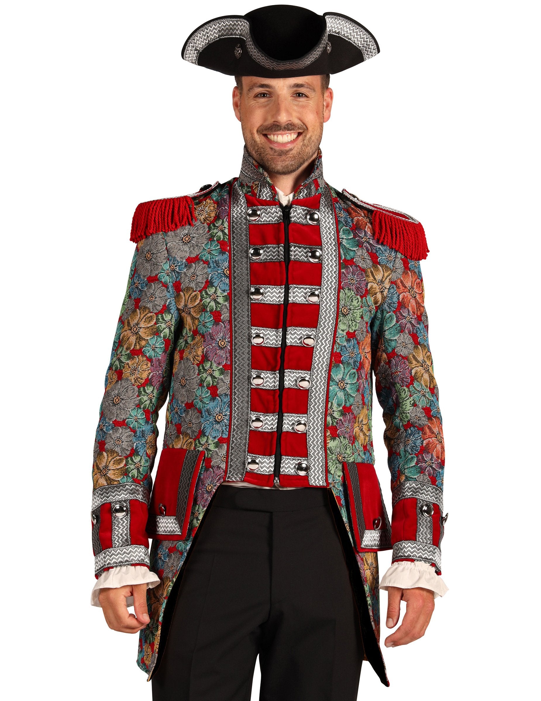Ta vrhunska moška cvetlična karnevalska jakna se ponaša z bogato vizualno privlačnostjo zaradi živahnih barv in zapletenih cvetličnih vzorcev. Rdeče epolete ustvarjajo strukturirano silhueto, dekorativni detajli pa poudarjajo njen eleganten videz. Kontrastne črte poudarjajo obliko plašča in dodajo pridih prefinjenosti vsakemu gibu. Popolna je za karneval ali kostumske zabave in elegantno dopolnjuje vsako obleko, ki želi izstopati.