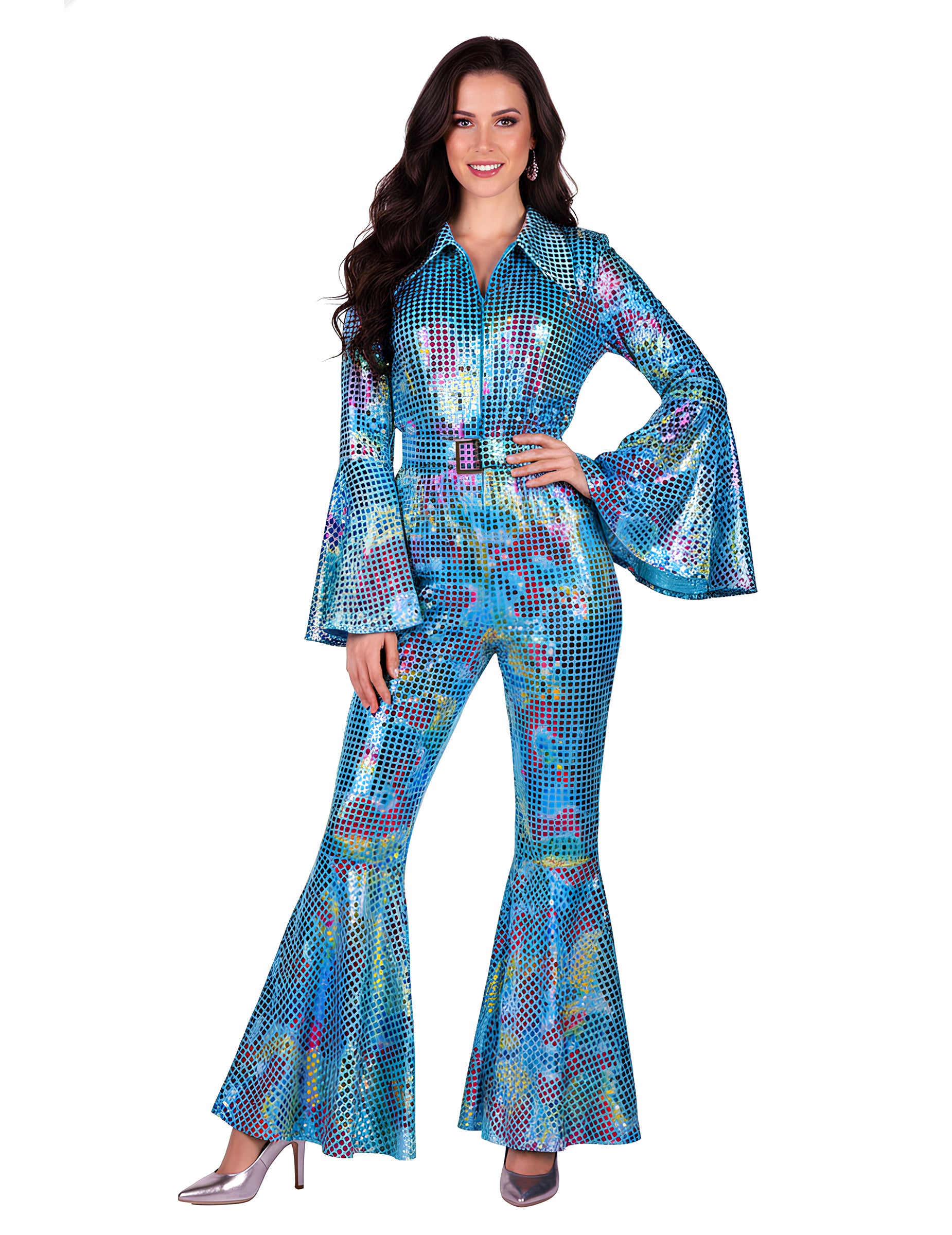 Ta vrhunski turkizni disko kombinezon za ženske takoj pritegne pogled s svojim bleščečim učinkom in živahnim odtenkom, idealen za praznovanje novega leta. Njegova večplastna odsevna tkanina osvetli vsak gib in daje osupljivo prisotnost od trenutka, ko prispete na zabavo. Razpršeni rokavi in zvonast rob ustvarjajo klasično disko silhueto, hkrati pa ponujajo tekoč in definiran slog. Kroj laska postavi, ne da bi preveč razkril, za eleganten in prazničen videz na vsakem živahnem dogodku.
