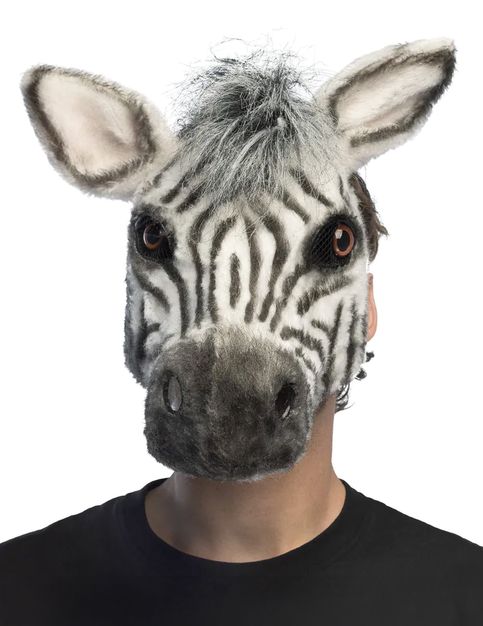 Ta pol-maska iz pliša v obliki zebre za odrasle ponuja takoj prepoznaven slog zahvaljujoč kontrastnim črtam in širokemu gobcu. Prekrita je z mehkim plišem, ima pokončna ušesa in razmršeno grivo, ki poudarjata njen živalski videz. Diskretna mrežasta cona v predelu oči omogoča udoben pogled, hkrati pa ohranja videz popolne maske. Je lahka in prijetna za nošenje, ter zagotavlja izrazito zebrovo identiteto za pust ali živalsko tematske zabave v kostumih.
