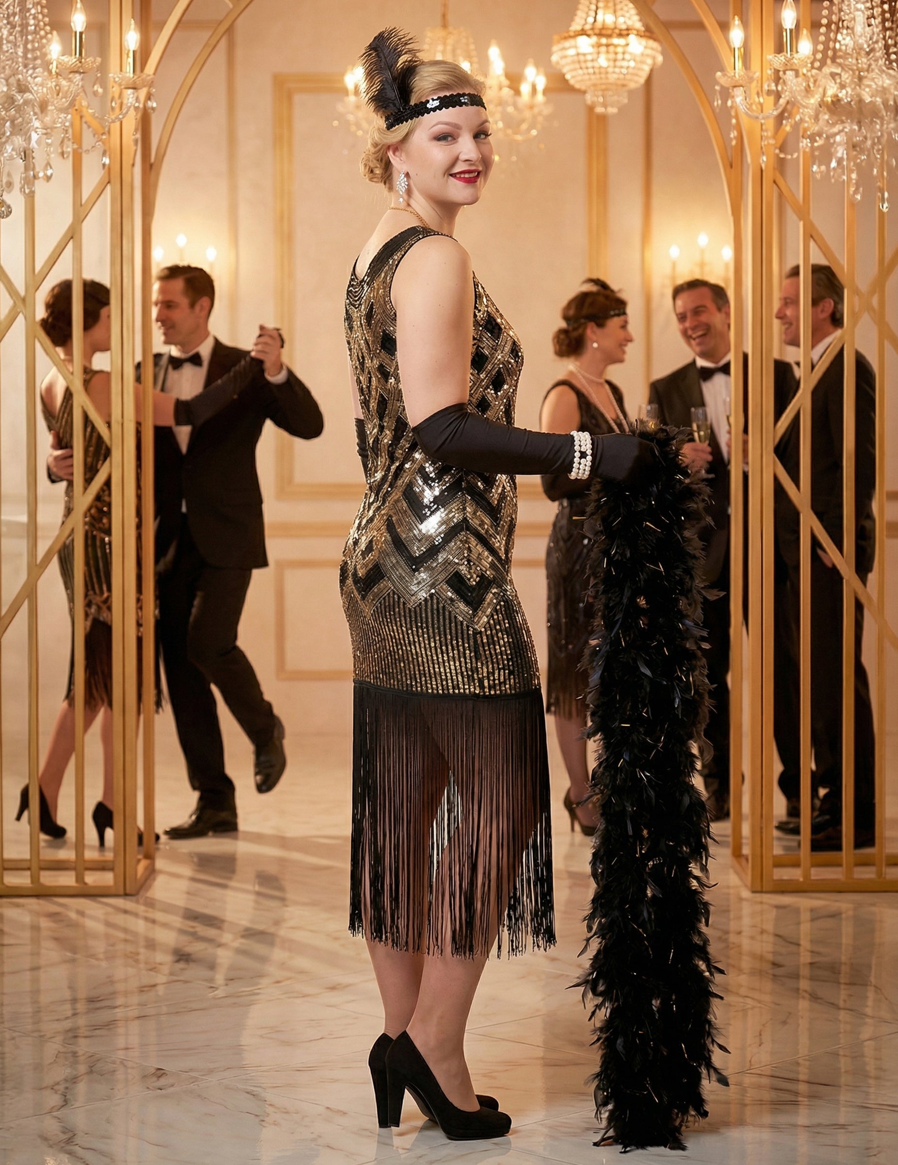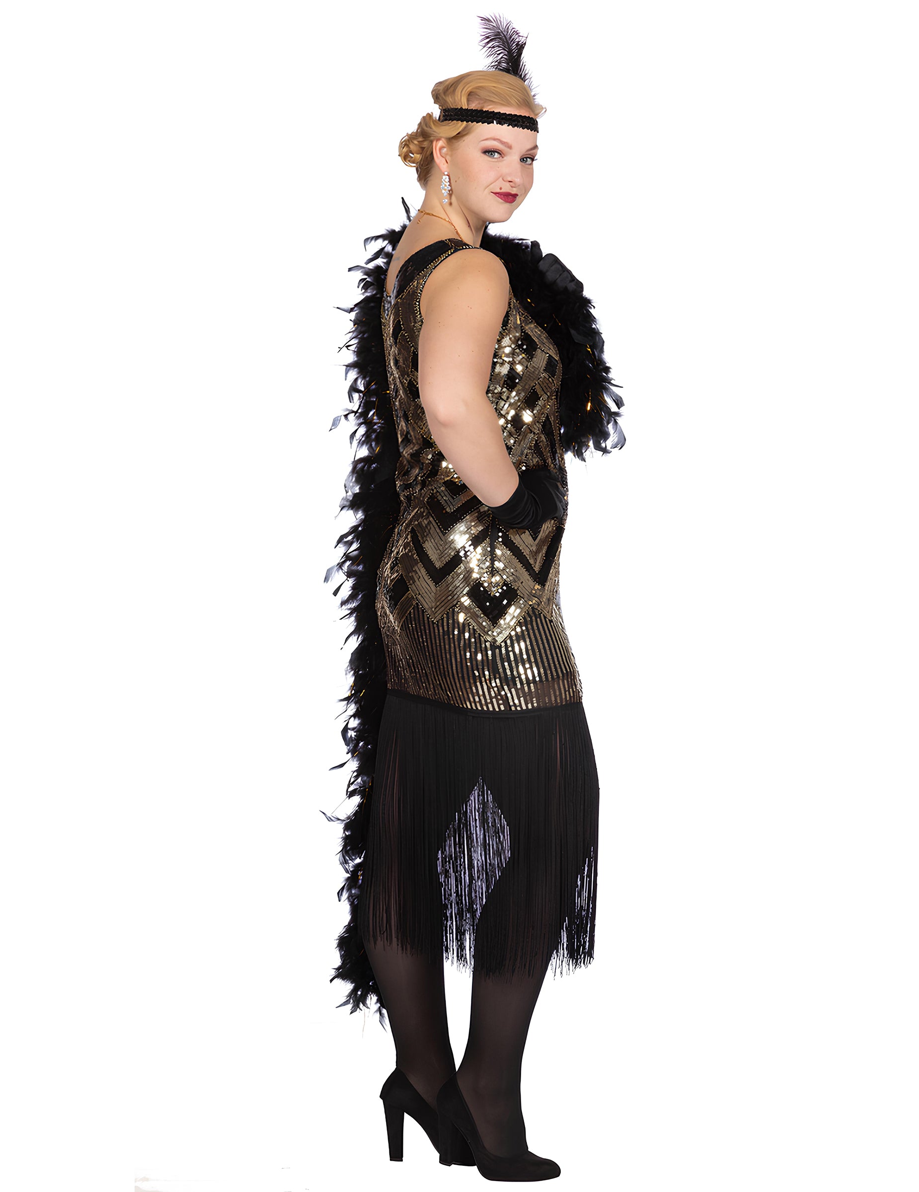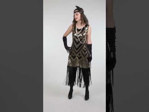 Ta luksuzna ženska charleston črno-zlata bleščeča obleka za preobleko izpostavlja obleko, katere kovinski bleščice tvorijo grafične vzorce, ki naravno pritegnejo pogled. Kombinacija črne in zlate ustvarja eleganten kontrast, ki daje kostumu resnično prisotnost.