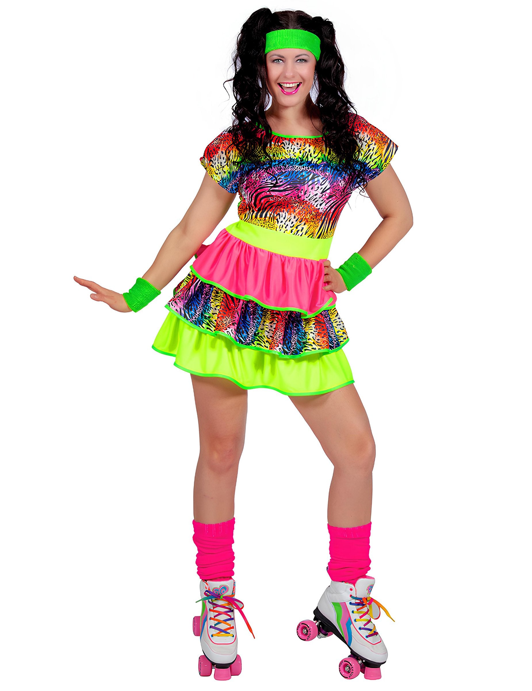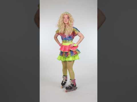 Ta kičasta ženska pustna obleka v slogu 80-ih let predstavlja obleko v živih barvah, ki združuje pisane vzorce in fluorescentne poudarke. Kratka krojena obleka s plastmi volančkov spominja na zabaven in pretiran slog te barvite dekade. Neon barve in mešani vzorci dajejo energičen in značilno retro videz, ne da bi bili preveč vpadljivi, hkrati pa ustvarjajo lahkoten in zabaven videz. Popolna izbira za tematsko zabavo v slogu 80-ih, karneval ali retro dogodek, kjer bo ta obleka prinesla živahen pridih in naredila vašo opravo še bolj veselo, dinamično in prijetno za nošenje.