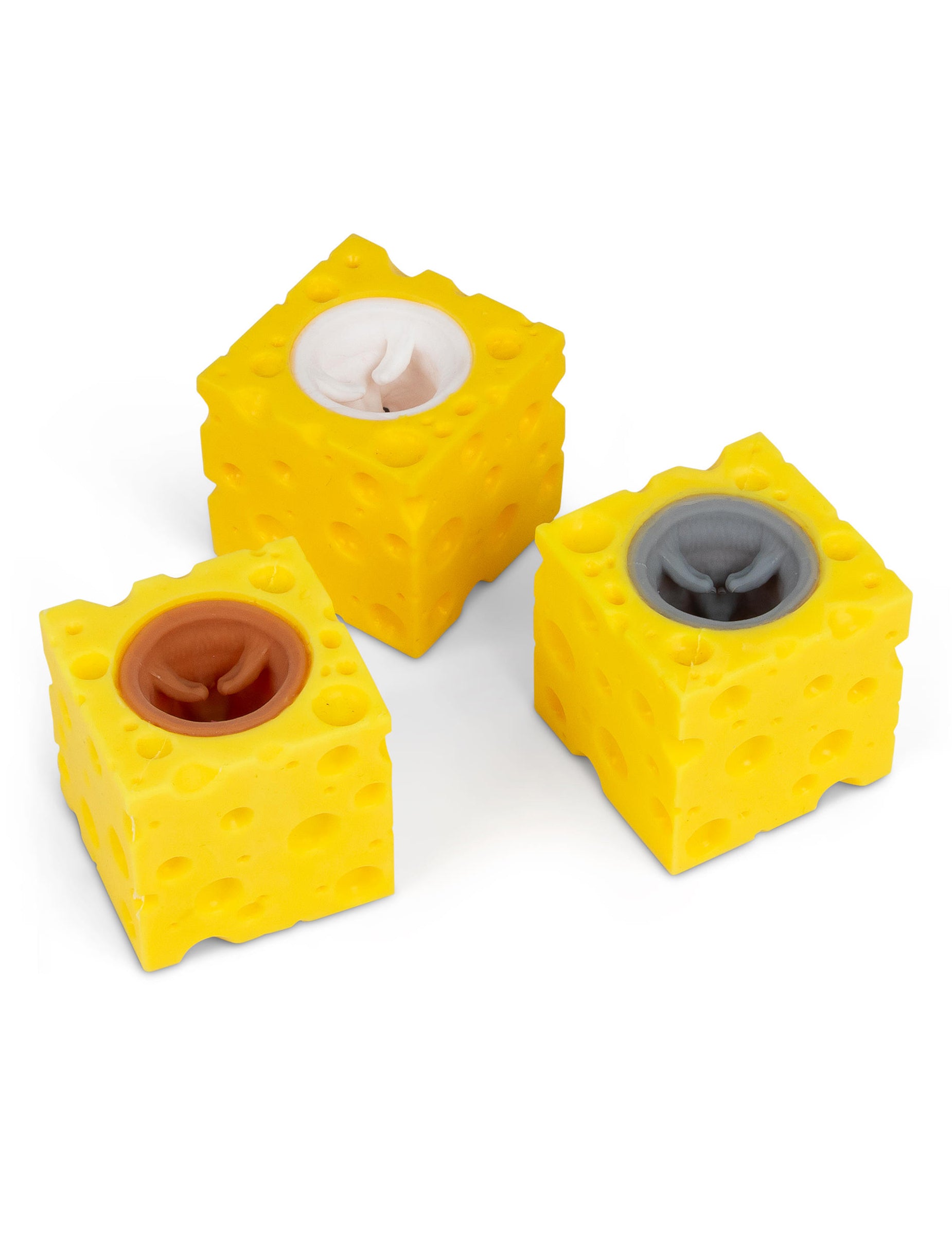 Rumena kocka ima teksturirano površino, prepredeno z luknjami, ki spominja na sir. S pritiskom nanjo se sprosti majhna, barvita miška, ki se dvigne in nato izgine, ko pritisk sprostimo. Mehka tekstura omogoča enostavno in prijetno držanje, vsak model pa ima lahko naključno barvo miške, kar doda element presenečenja.