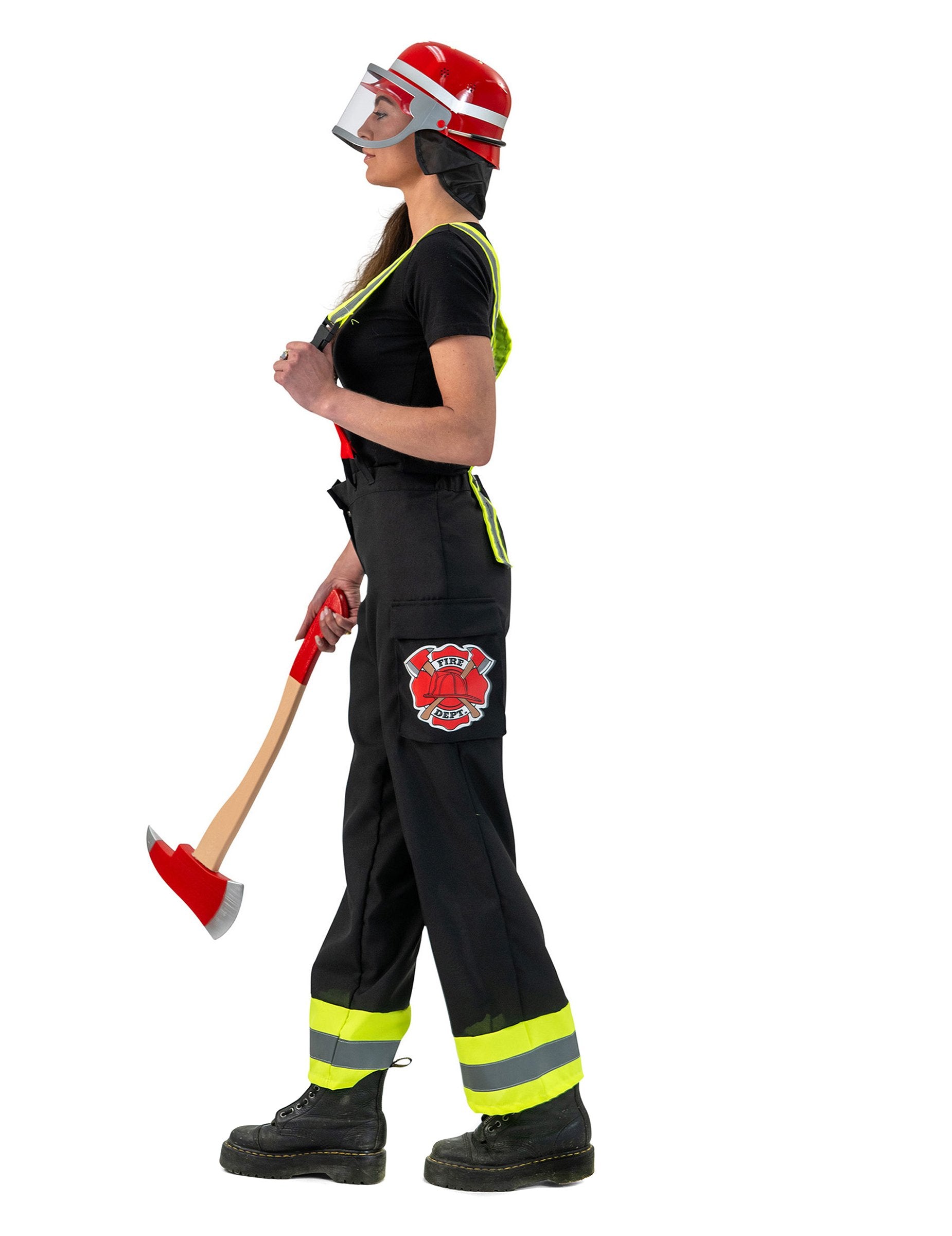 Hlače z naramnicami so črne z rumenimi črtami na spodnjem delu. Rdeče naramnice dodajo značilen pridih in pomagajo, da hlače ostanejo na mestu. Vzorec. gasilec je prisoten ob strani, da okrepi temo.