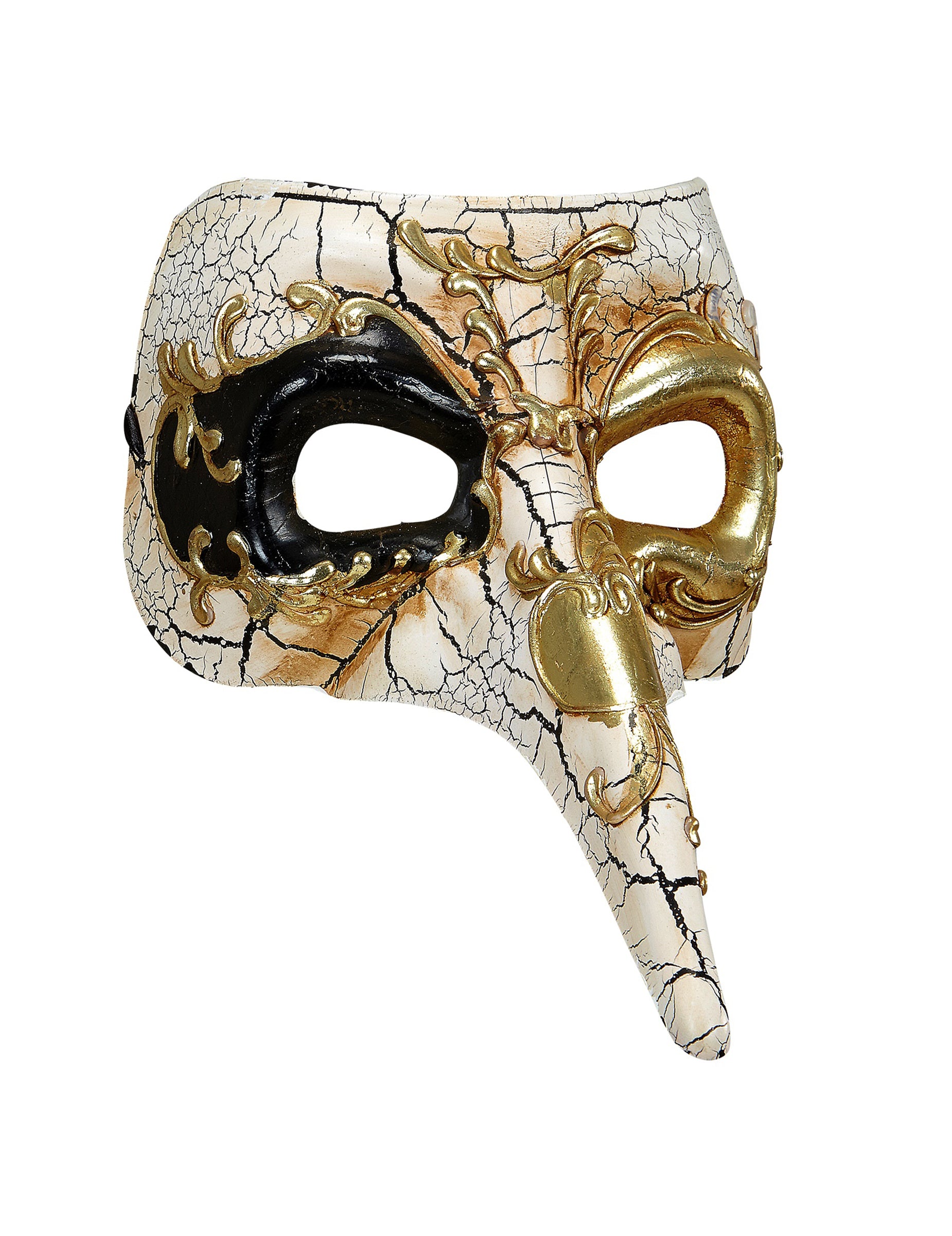 Ce demi-masque vénitien long nez doré adulte présente une base claire décorée d’un effet craquelé et de motifs dorés autour des yeux et sur les côtés du masque.