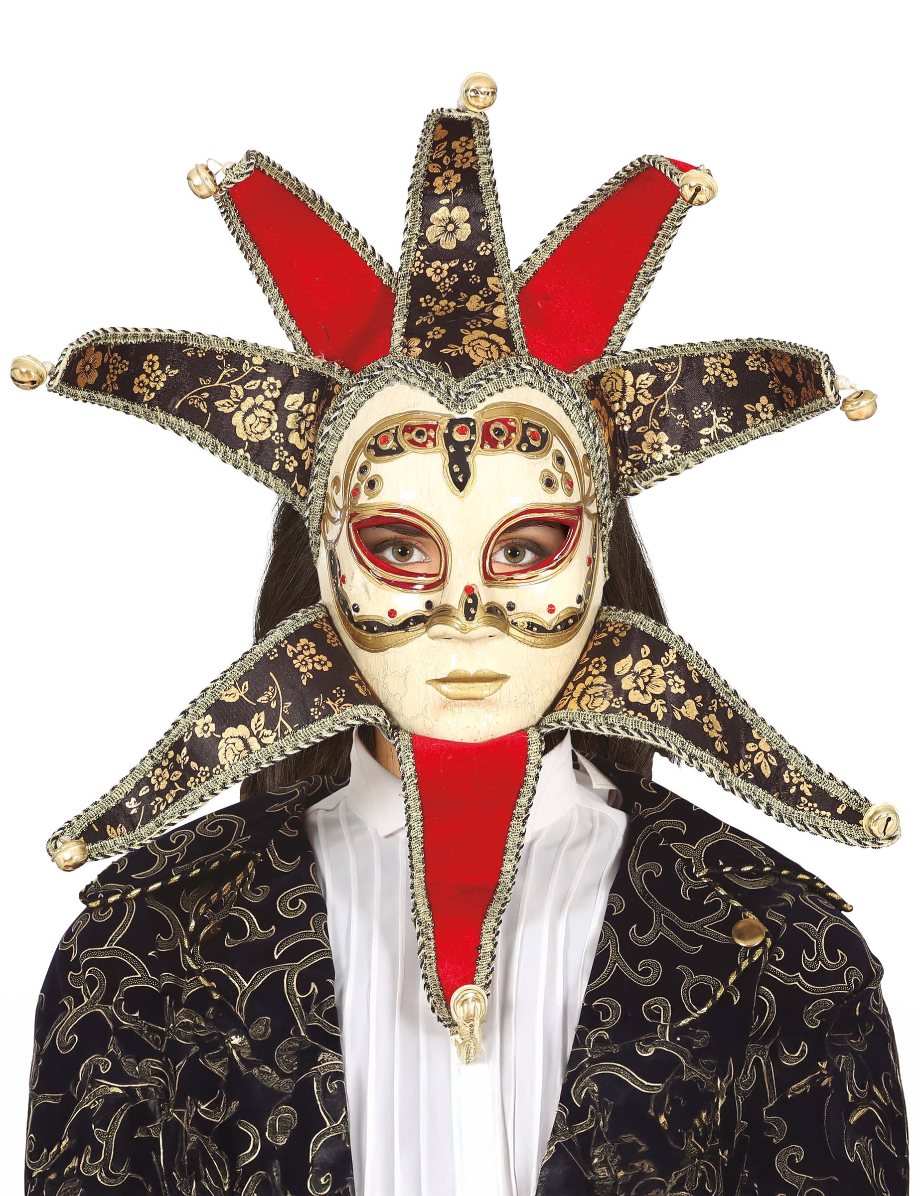 Kombinacija rdeče, črne in zlate ustvarja izrazit kontrast, ki se zlahka ujema s kostumom za ples pod maskami ali za beneški karneval.