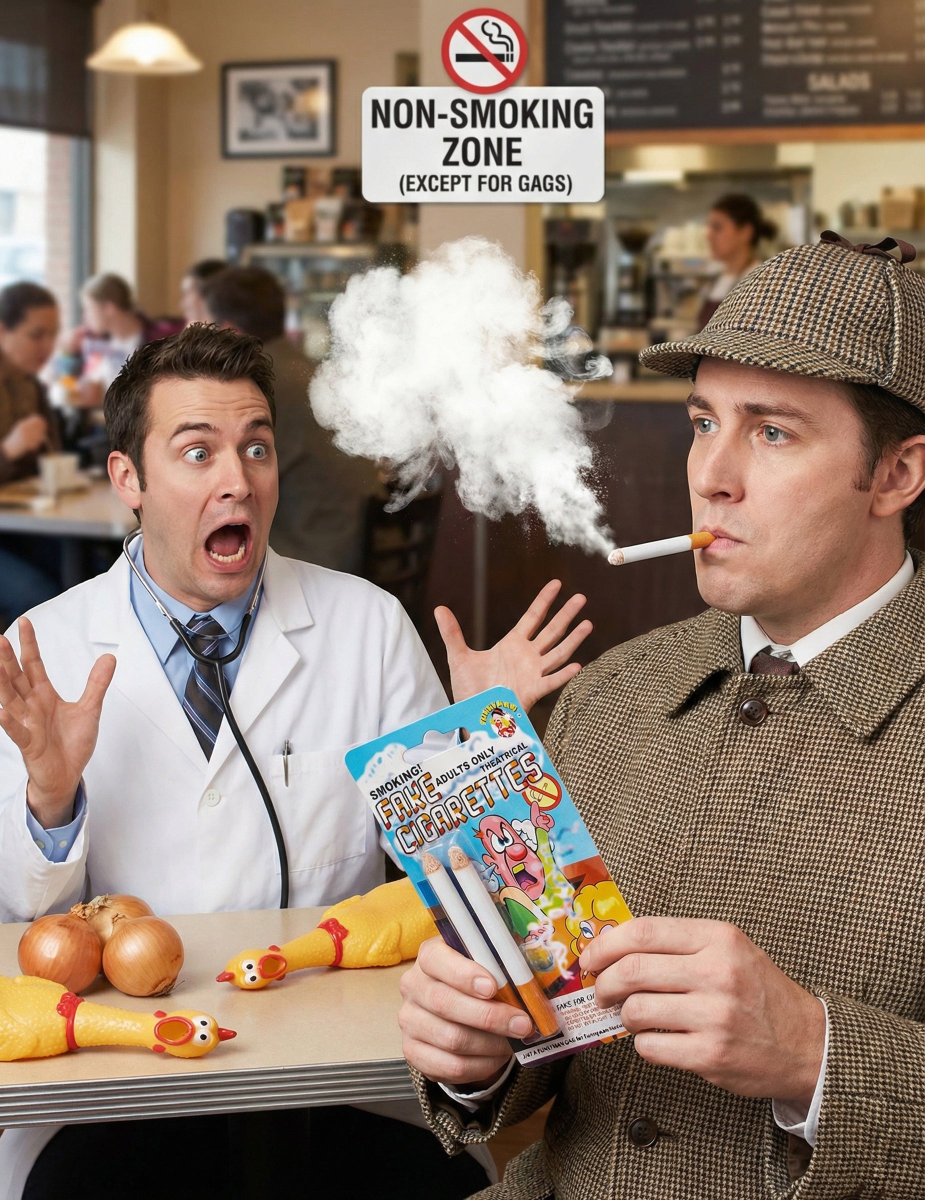 2 lažni kadilni cigareti posnemata videz pravih cigaret in ob pihanju oddajata rahlo dim. Ta preprost učinek hitro preseneti in pogosto povzroči spontan smeh.