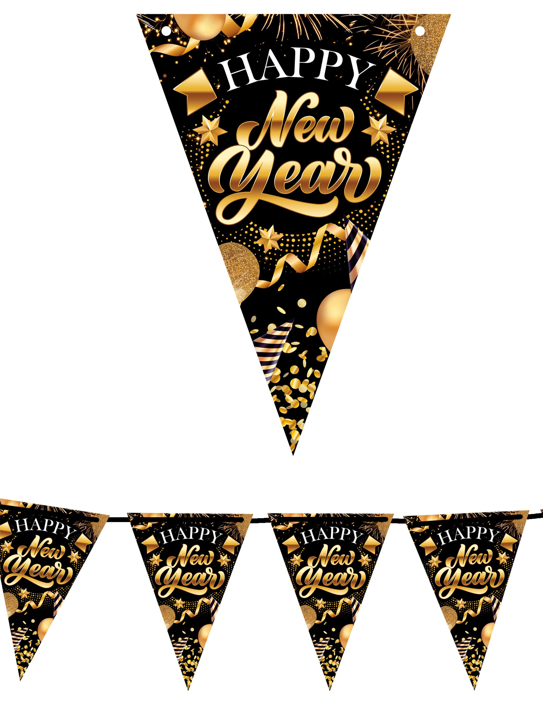 Ona meri približno 300 cm in vključuje več trikotnih papirnatih zastavic. Vsaka zastavica prikazuje praznični dizajn z zvezdicami, konfeti in besedami "Srečno novo leto" z zlatimi črkami. Kontrastne barve ustvarjajo jasen vizualni učinek, ki ga je enostavno vključiti v silvestrsko dekoracijo.