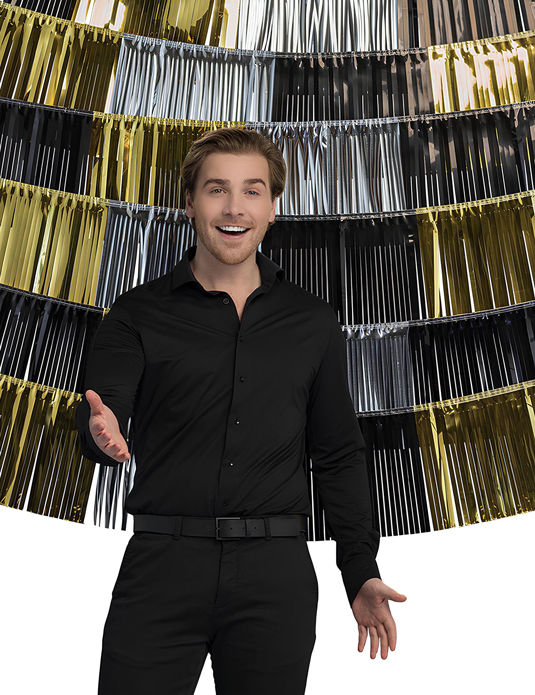 Ta kovinska ozadna zavesa iz resic je odlična za okrasitev stene ali foto kotička na vaših prazničnih zabavah.