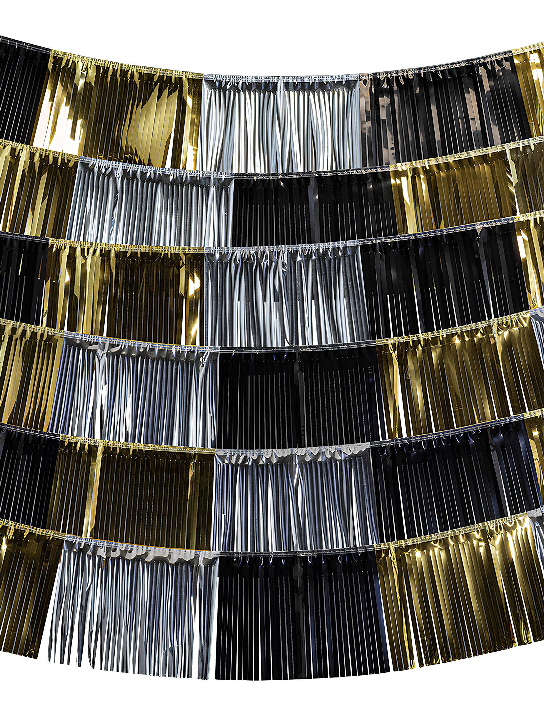 Sestavljena je iz resic s kovinskim videzom v zlatih, srebrnih in črnih odtenkih, razporejenih v več vodoravnih trakovih. Vsak element meri približno 150 x 26 cm, kar omogoča pokritje vidne površine in ustvarjanje izrazitega dekorativnega učinka.