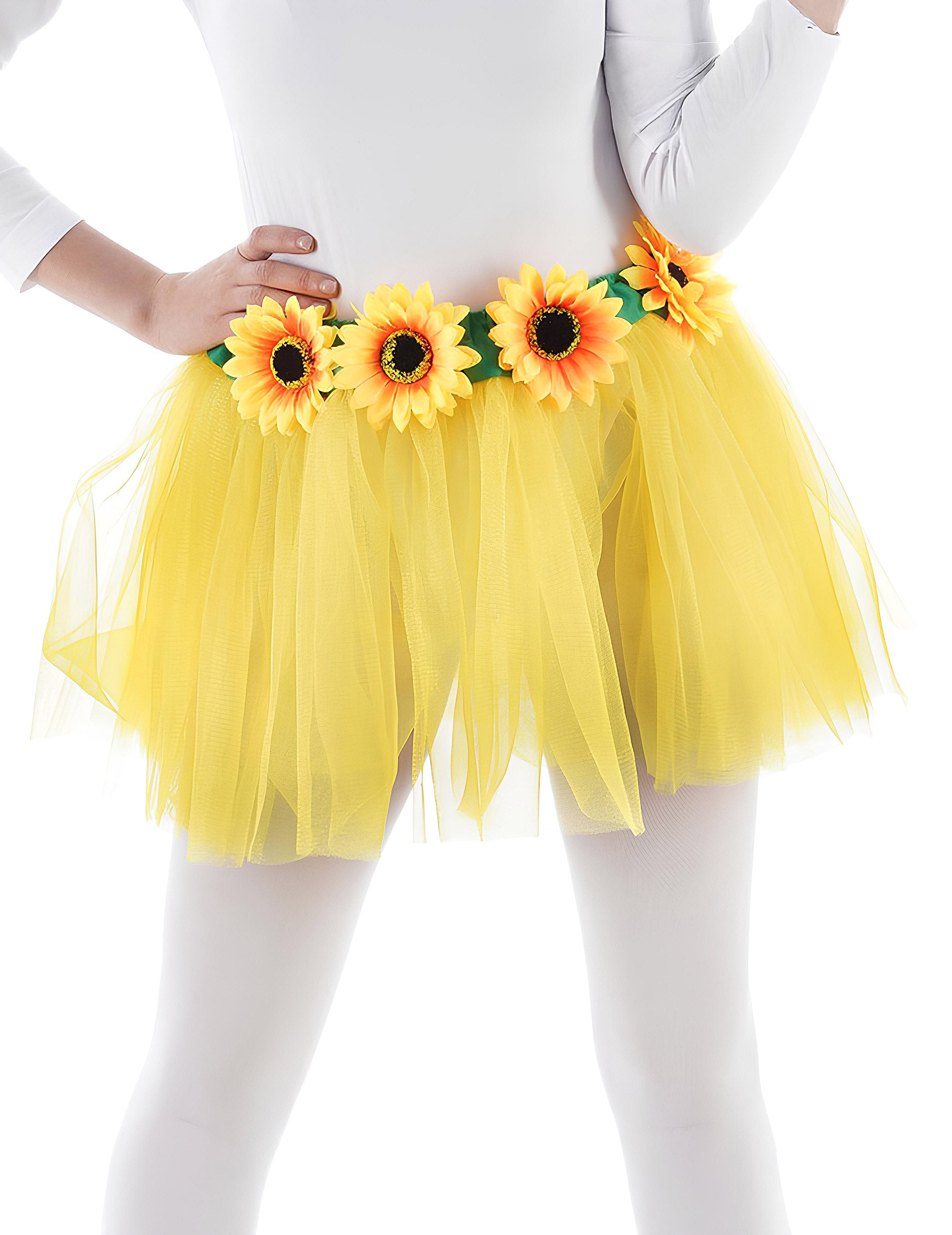 Ce tutu se compose de plusieurs couches de tulle jaune, créant un volume visible autour de la taille. La ceinture est décorée de tournesols jaunes avec un cœur foncé, répartis tout autour pour un effet homogène. La longueur du tutu arrive environ au milieu des cuisses, permettant de le porter par-dessus un legging, un collant ou un justaucorps selon le style recherché.