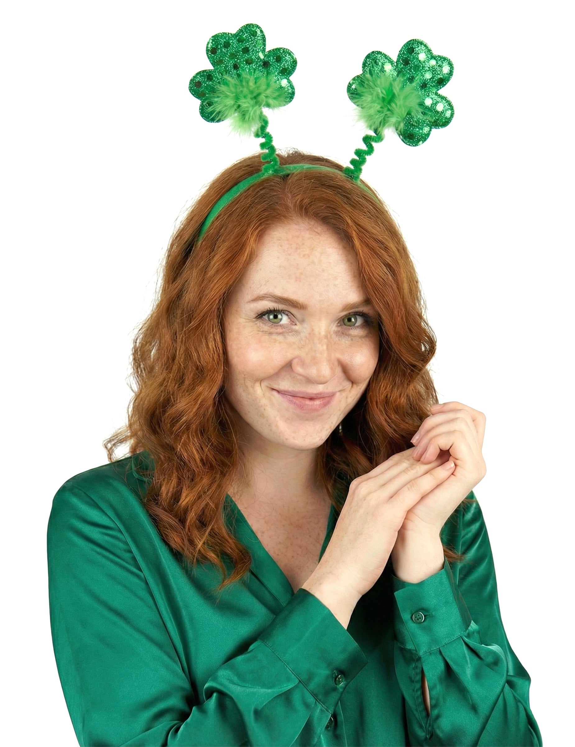 Naglavni trak je zelene barve in okrašen z dvema bleščečima deteljicama, nameščenima na prožnih steblih. Zelene bleščice dodajo kanček leska, deteljici pa ustvarita dimenzijo in gibanje, ko ju nosite. Naglavni trak se zlahka poda k zabavni obleki ali kostumu.