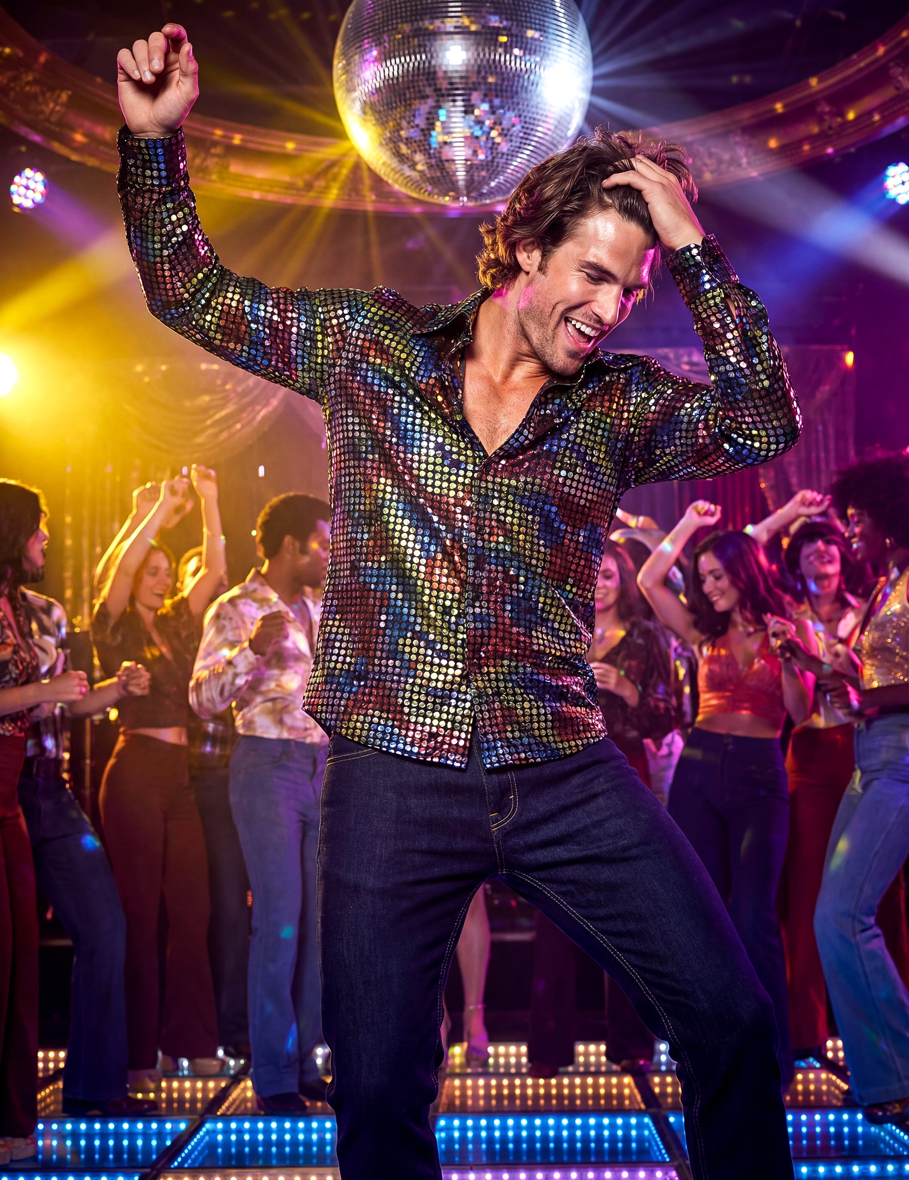 Tam Moška večbarvna disko majica Omogoča vam, da ustvarite praznično obleko v retro slogu, ki je idealna za tematske zabave in kostumske dogodke. Njen dizajn jasno odraža disko estetiko.