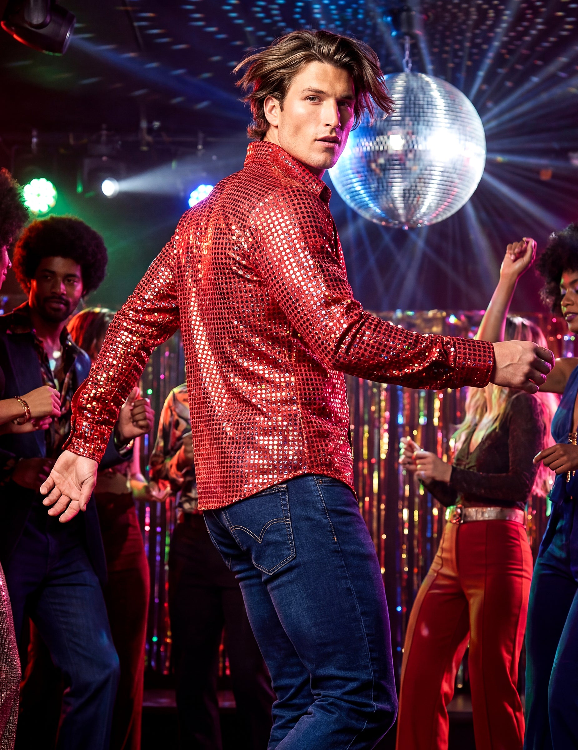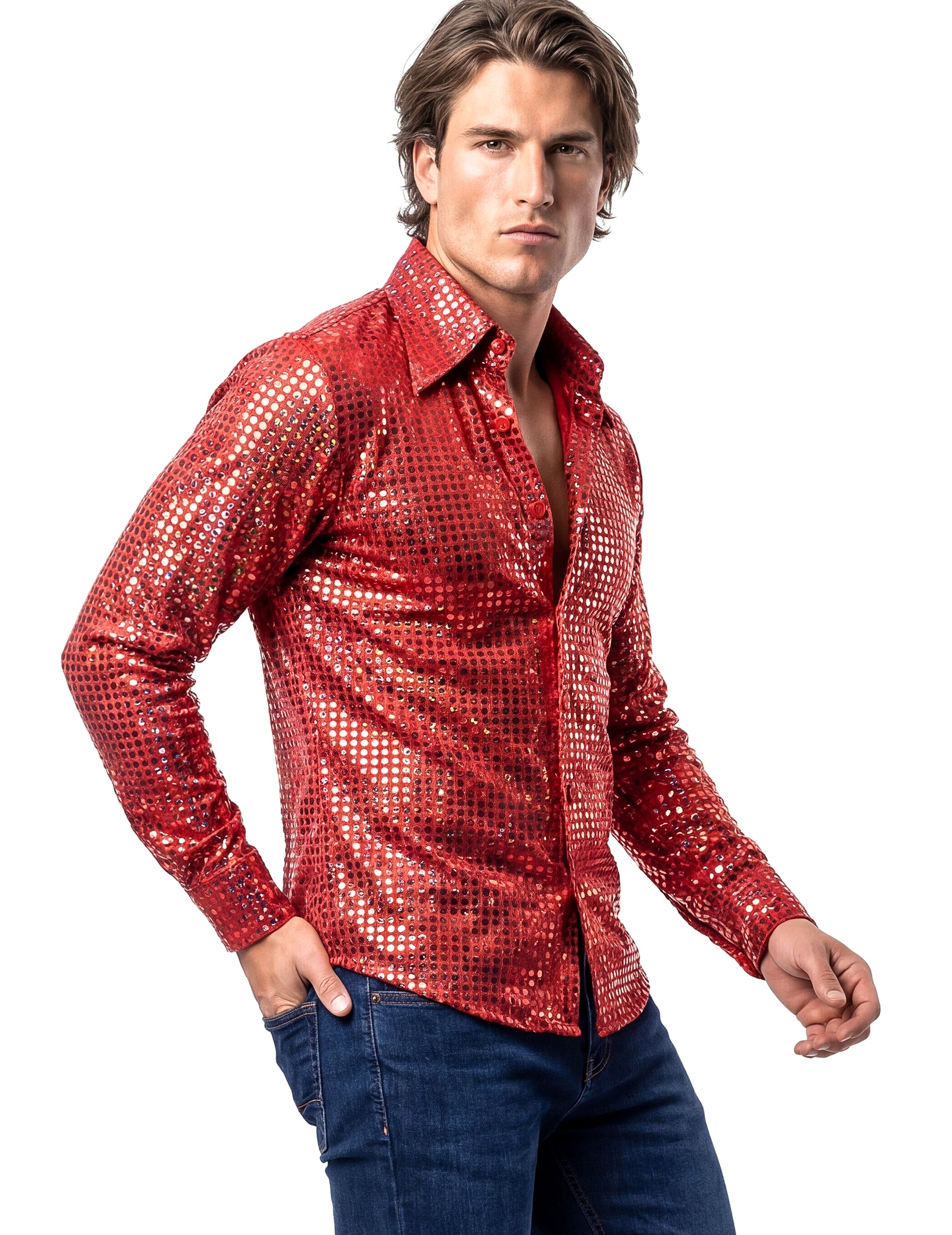 Rdeča disko srajca za moške je primerna za pust, disko zabavo, zabavo v slogu 70-ih, rojstni dan, novo leto ali tematsko zabavo z maskiranjem.