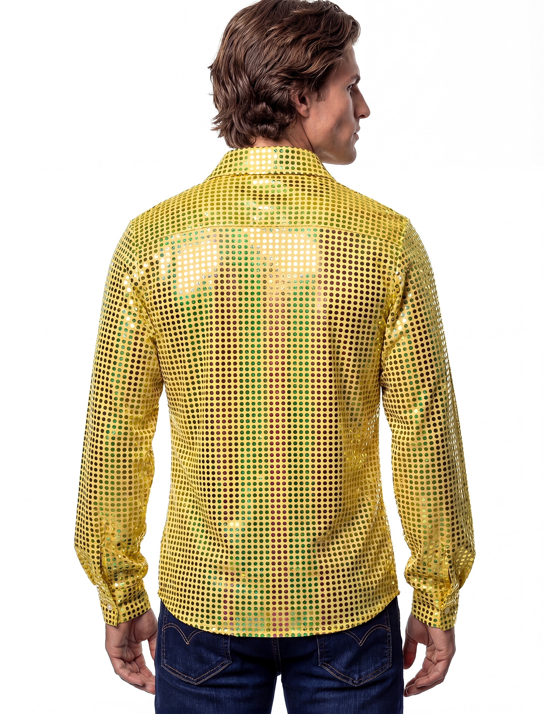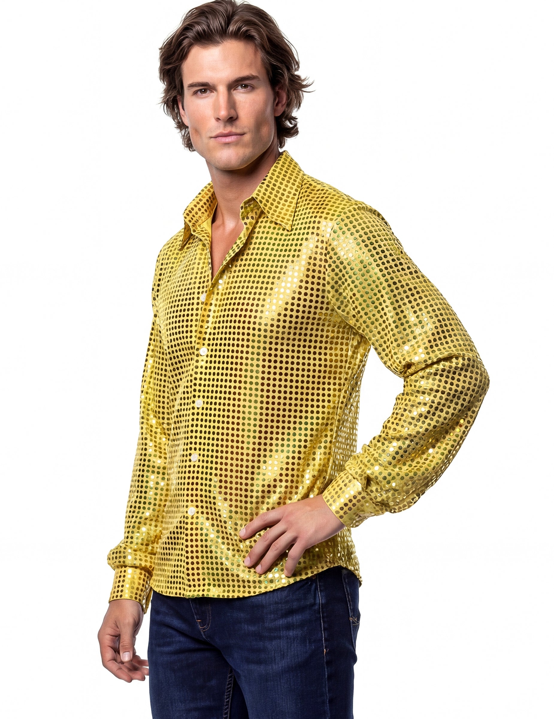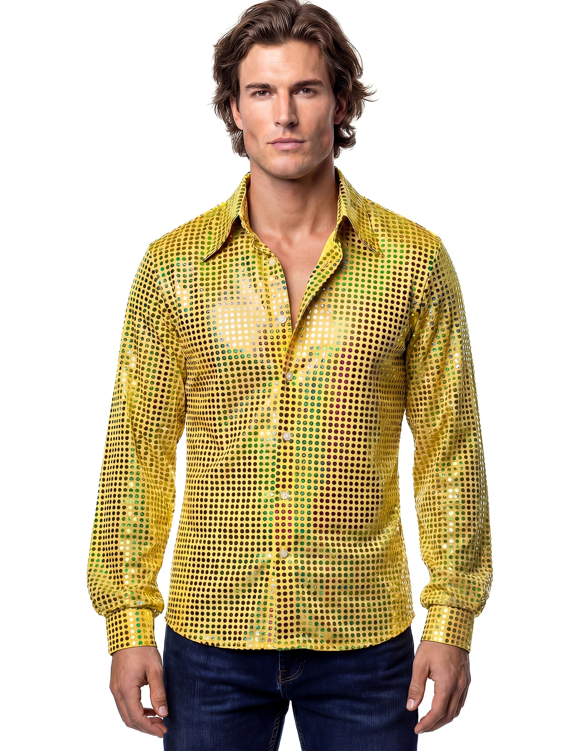 Majica ima po celotni površini živo rumen vzorec, ki ustvarja svetleč učinek, ki se spreminja glede na osvetlitev. Njen raven kroj, dolgi rokavi in odprt ovratnik so značilni za disko oblačila. Mehka tkanina se giblje z vami in laska vaši postavi na plesišču.
