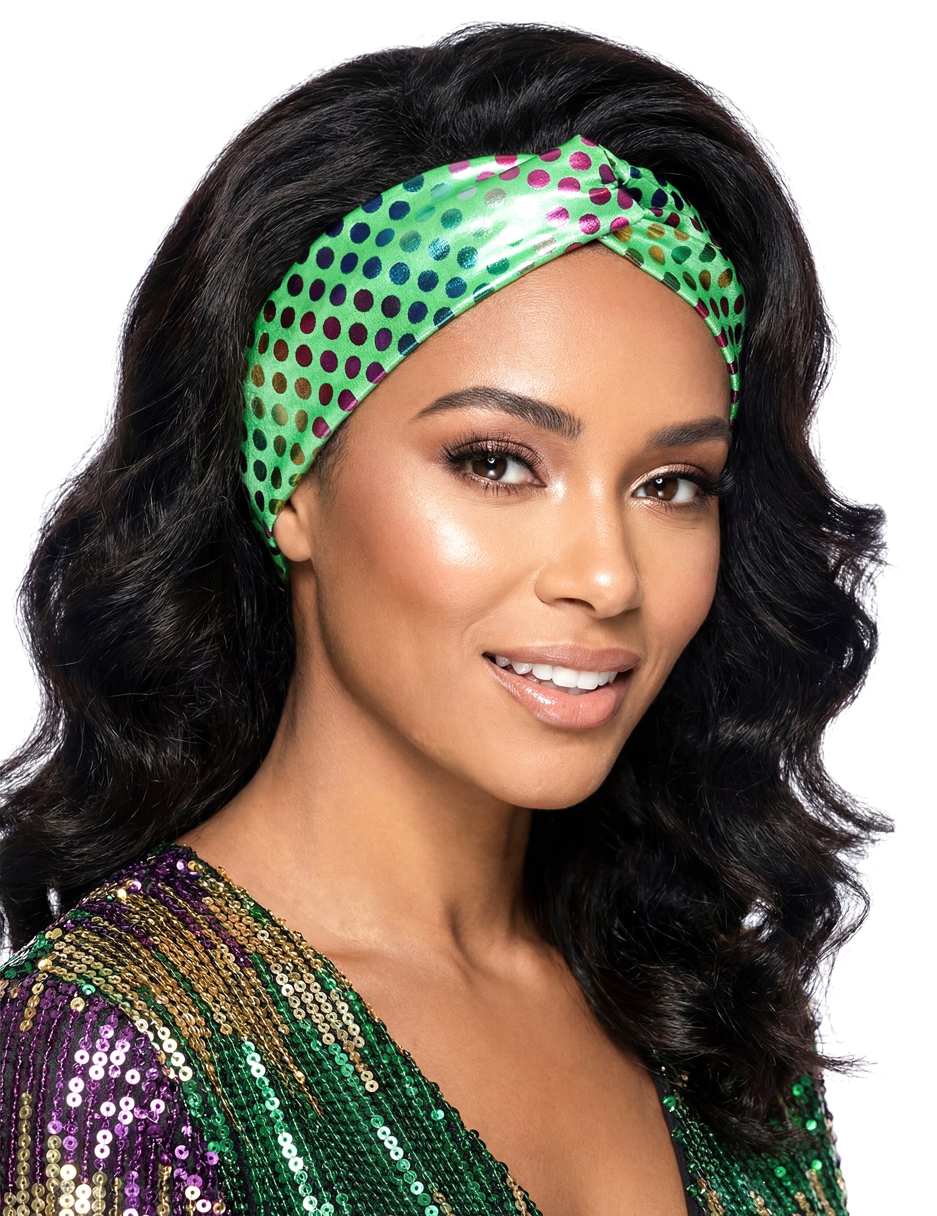 Le bandeau présente un motif vert brillant réparti sur toute la surface, avec un effet lumineux visible selon l’éclairage. Sa forme large permet de le porter sur le front ou dans les cheveux, en rappel des codes vestimentaires disco. Il s’associe facilement à une combinaison, une chemise ou une tenue rétro.