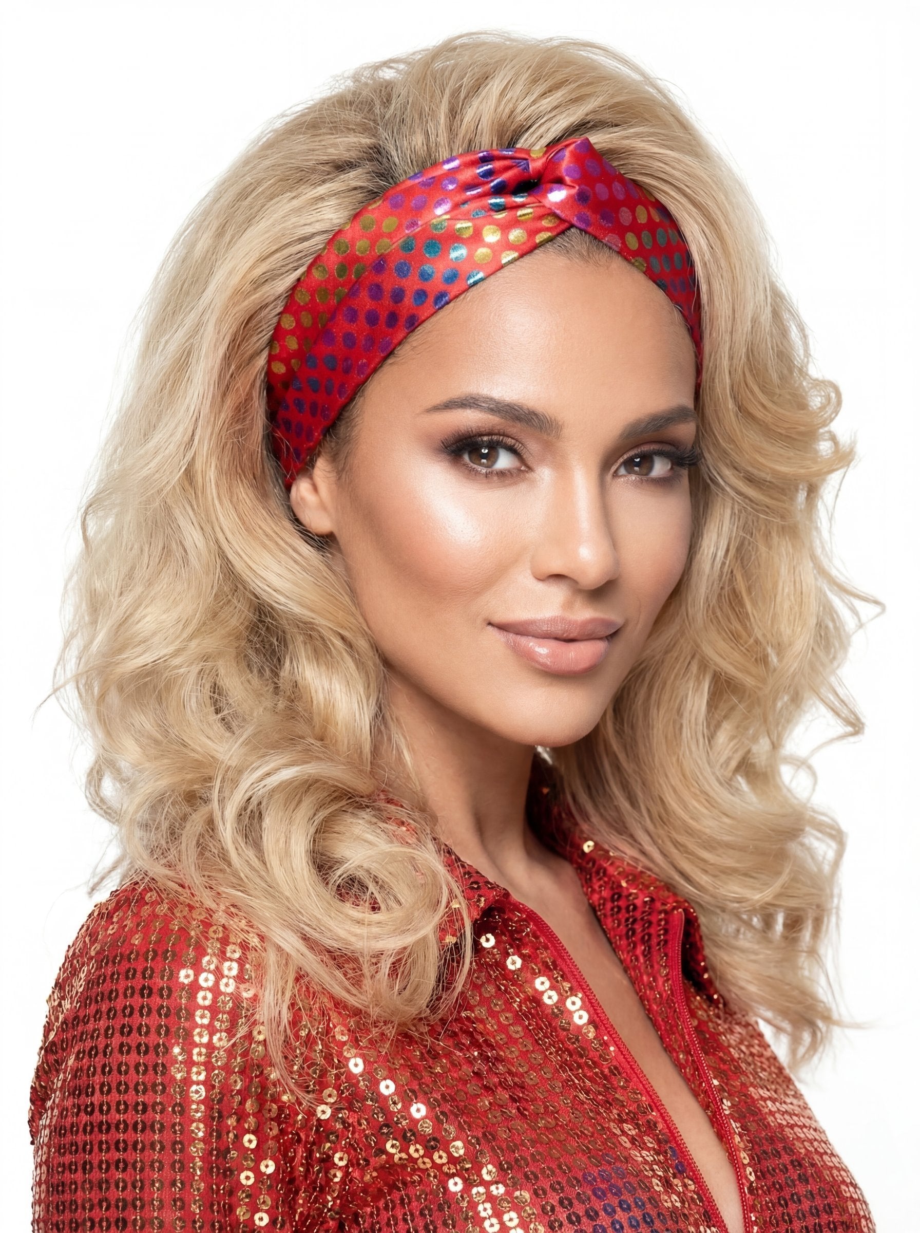 Le bandeau présente un motif rouge brillant réparti sur l’ensemble de la surface, avec un effet lumineux visible selon l’éclairage. Sa forme large permet de le porter sur le front ou dans les cheveux, rappelant les accessoires emblématiques des tenues disco. Il s’associe facilement à une combinaison, une chemise ou une tenue rétro.
