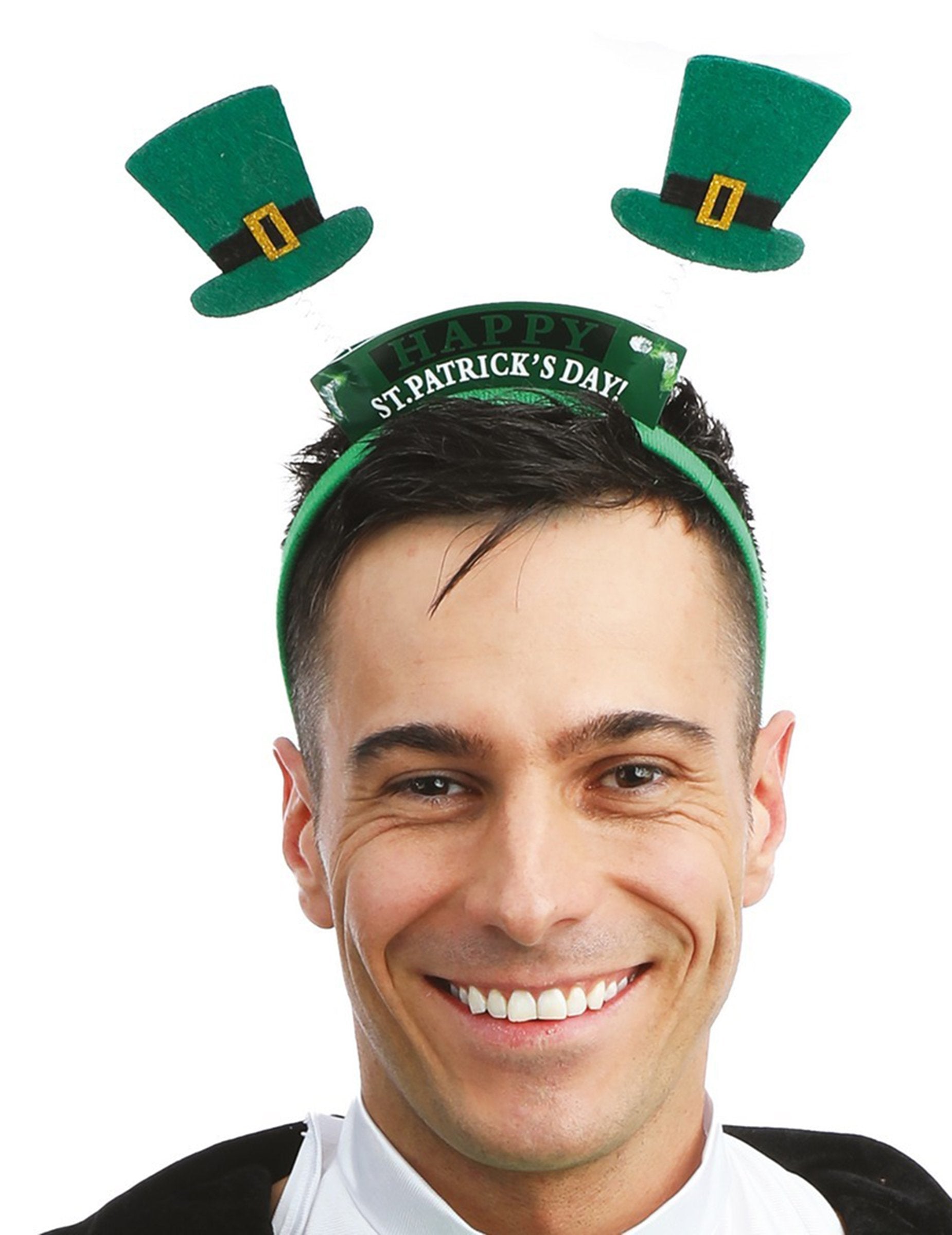 Naglavni trak je zelene barve in okrašen z dvema miniaturnima cilindroma, ki spominjata na dan svetega Patrika. Na osrednjem traku je viden napis "Srečen dan svetega Patrika", ki poudarja praznično temo. Zaradi lahke zasnove ga je enostavno nositi na zabavi ali živahnem dogodku.