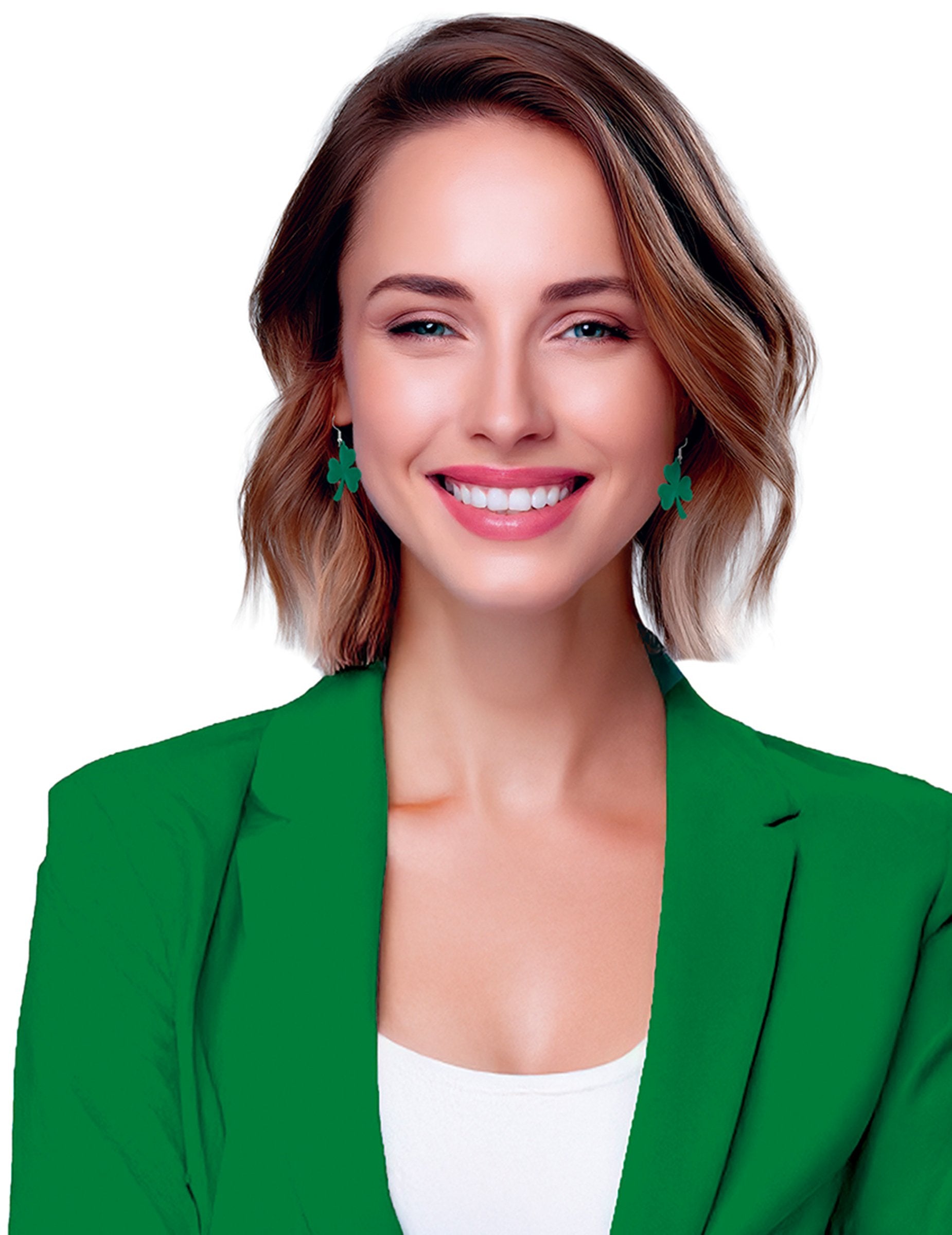 Vsak uhan predstavlja zeleno deteljico, obešeno na kovinsko kljukico, ki med nošenjem rahlo niha. Njihova ploščata oblika in enotna zelena barva spominjata na tradicionalni svet sv. Patrika in se zlahka kombinirata z zelenim kostumom ali irskim pustnim preoblačenjem.